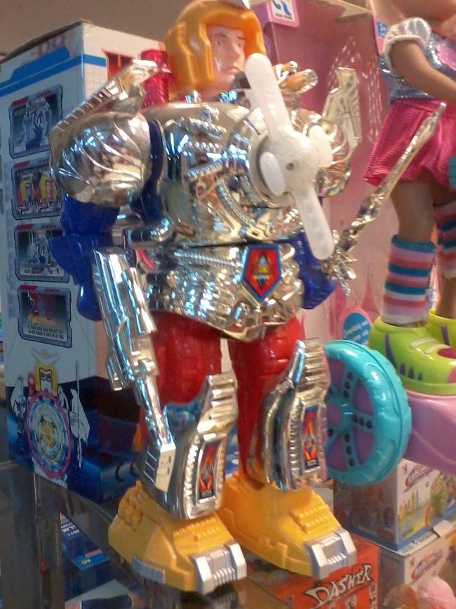 And can you blame me? Look at that face! He never signed up for this. He wanted to be a baker, or an apprentice to a baker, and now look at him, all chromed out like RoboCop’s trashy cousin, with a chestpiece that looks like Tony Stark built the Mark I Iron Man in an antique warplane museum. The box seems to indicate that if we dared wake him from his unblinking slumber, we would be blinded by the spinning LEDs all crap toys are required to have by law. I feel sorry for this poor bastard if stealth is ever a mission parameter, but not as sorry as he feels for himself.