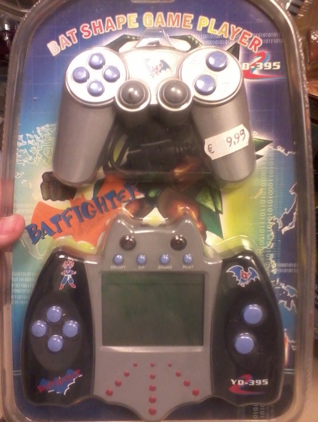 Look kids! It’s everyone’s favourite comic book character “BATFIGHTER”! In this Game of The Year edition not only do we get to play the thrilling adventures of “BATFIGHTER”, but the system itself is also bat-shaped. Or you are. Honestly it’s a bit hard to tell whether the “BAT SHAPE GAME PLAYER” is the system itself or the poor fool who actually has to play this garbage. As a side note, this… thing, actually managed to somehow be a backwards Wii U, long before there was a Wii U to be the backwards version of, with buttons on the screen itself, and on an additional controller. Just in case you wanted to sit far enough away to play it without actually having to look at it.