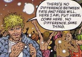 Which leads us to the second, more metaphorical vehicle for explaining the complex cosmological dimensionality Morrison espouses. This one went long-misunderstood by many readers – perhaps surprisingly given the ontological leaps required to understand the first. When John A Dreams pulls on the timesuit, he disappears because he moves a level up. The level “up”, the dimension above the narrative dimensional manifold of the comic, becomes literal, the comic becoming again a collection of 2-D planes/pages in a 3-D bulk/saddle stitched book in our dimension. John becomes the readership. This notion is explained by the term “fiction suit”. This is the time suit as seen from our perspective – the characters in The Invisibles are suits we wear in which to appreciate the fictions Morrison has created for us, and importantly, vehicles by which the writer can also enter the fiction, a larger dimensional being stepping “down” into his creation.