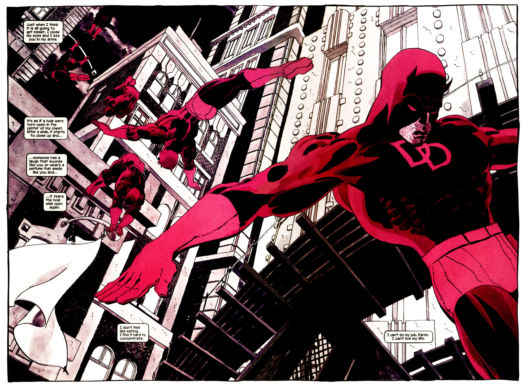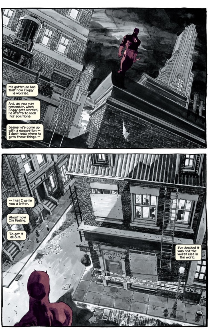 The story is framed as Matt struggling to come to terms with the loss of his murdered former love Karen Page, and has him writing letters to her as a way to try and cope with his crippling grief. Skipping over the accident that served as the source of his powers, the letters begin by touching on Matt’s ultimately tragic relationship with his father before moving on to the early formation of the Nelson and Murdock Law Firm, before finally chronicling Matt’s first meeting with Karen herself. While it undoubtedly has its bright, colourful, swashbuckling moments (the showdown between an early DD and Electro, for example, is beautiful in its Golden Age simplicity), this is essentially a love story, and the blossoming – yet heartbreakingly tragic – relationship between Karen and “Mister Murdock” makes for utterly compelling reading throughout.