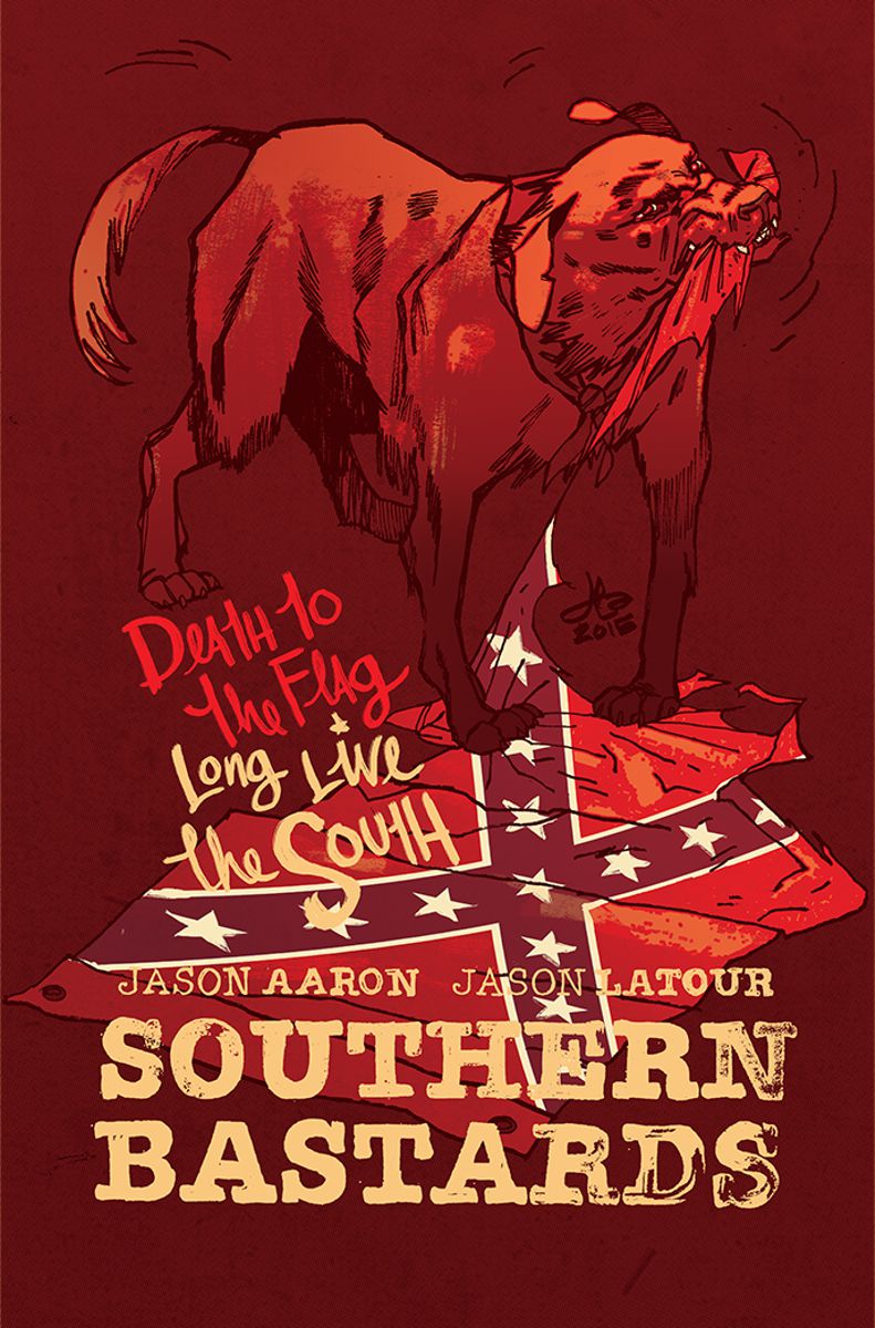 Straight off the bat, let’s talk about what Jason Latour had to say about the controversy surrounding the Confederate Flag. Originally published on the 28th of June on his Tumblr, it has been reprinted in the back of this very issue. The variant cover to this issue shows a dog ripping apart the flag that has been a symbol of Southern Dominance and Race Discrimination for some time, and for an artist who hails from this part of the country to come out and show this was commendable, bold and noble.