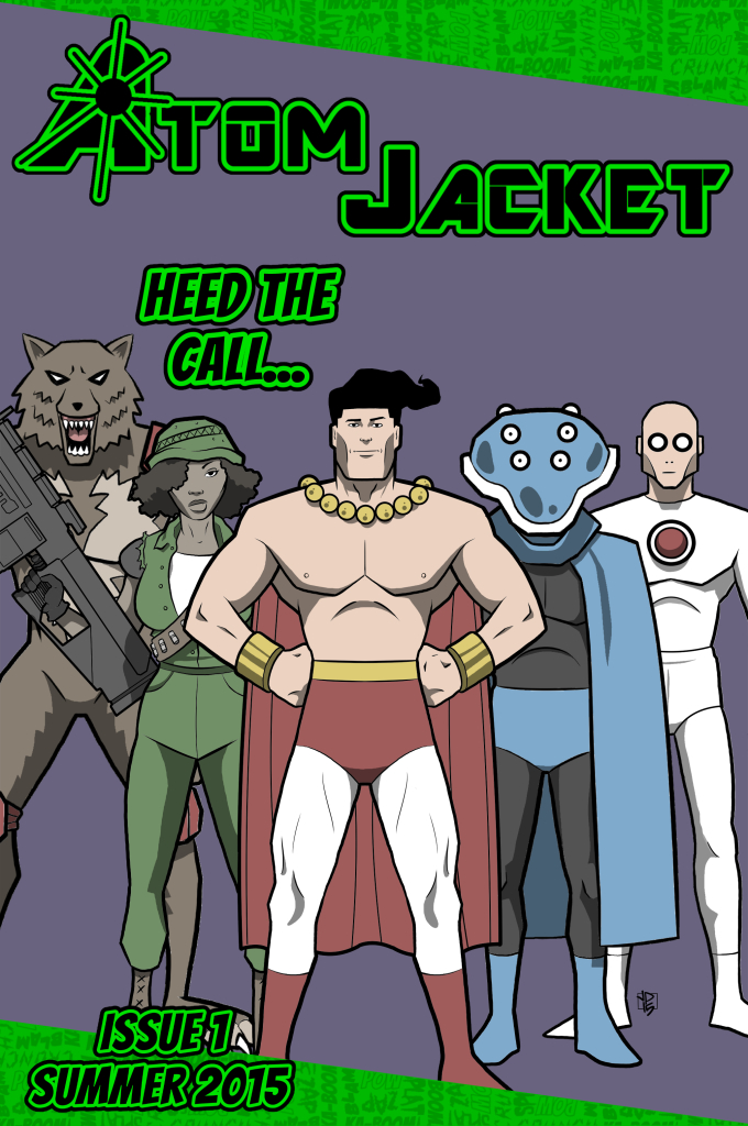 OK, so Atom Jacket is an anthology piece billed to us as: “Tales of SciFi intrigue and caped heroism.” We had no idea what we’d been sent. Man, I’ve been picking some weird sh*t to review lately and this is no exception. It’s very British in its weirdness and does remind me of old 2000 AD progs in both art and content, and each story is – well – a bit nuts. Here is the rundown: