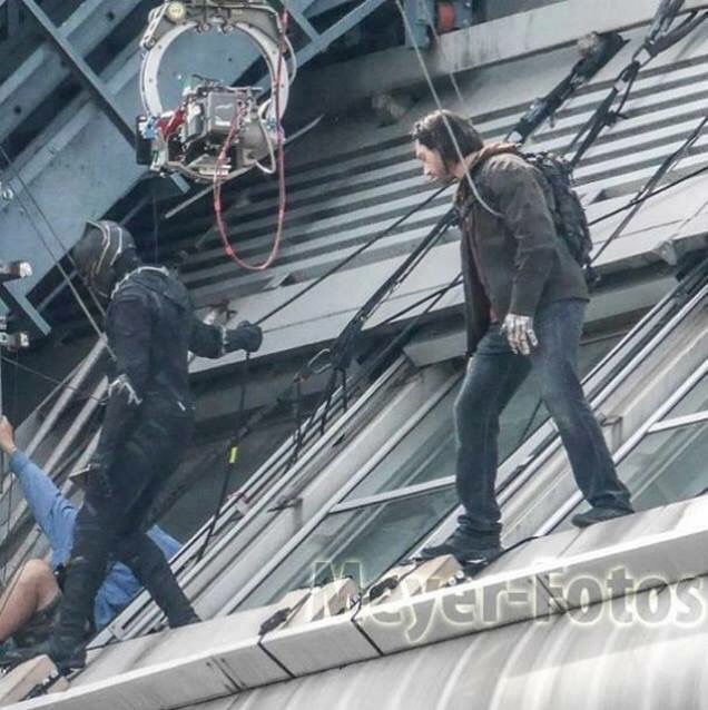 The image shows the King of Wakanda (or, a stuntman at least) hanging out – literally – alongside a Winter Soldier stunt-double.