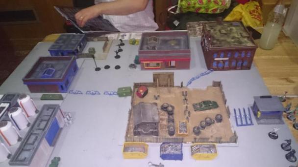 3 objectives each – Ammo and Titan (stat boost) for both of us, Loot in the centre from my opponent and from me a couple of Riddles down (they’re 2 for 1) – crazy Eddie’s dirty secrets and stash! You can use any but only your opponent’s are with points (usually). We were keen to see if the game felt sufficiently cinematic, and for scenario we got Patrol – opposite corners, a vp for first hit, 3 for ending in the opponent’s deployment. Time to play this!