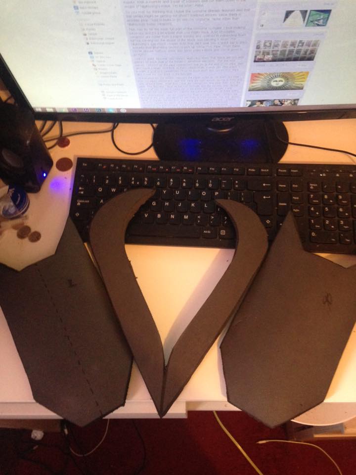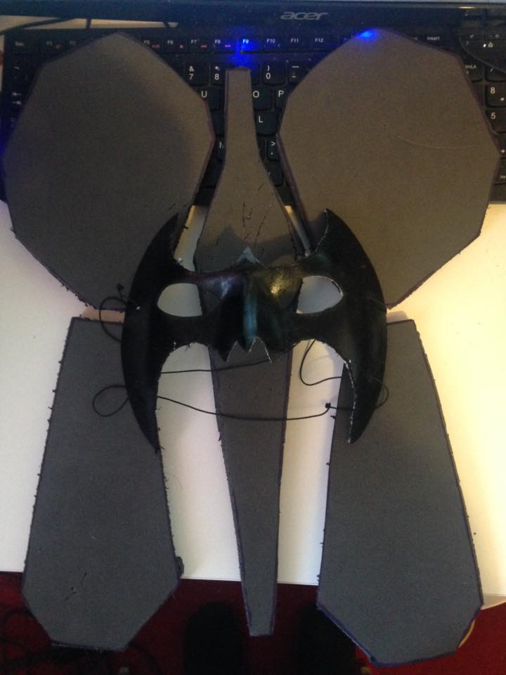 Since last week, I made the shape for my V which is going to sit across the top of the chest plates. I also made some shoulder pads and will be making wrist gauntlets as well which will all be painted blue and run down the side of my arm. I also made the back plates and the spinal guard out of EVA foam. Finally I snuck into the batcave and pinched one of batman’s masks, took a marker and a pair of scissors and cut them down to the shape of Nightwing’s mask. I’m he won’t mind.