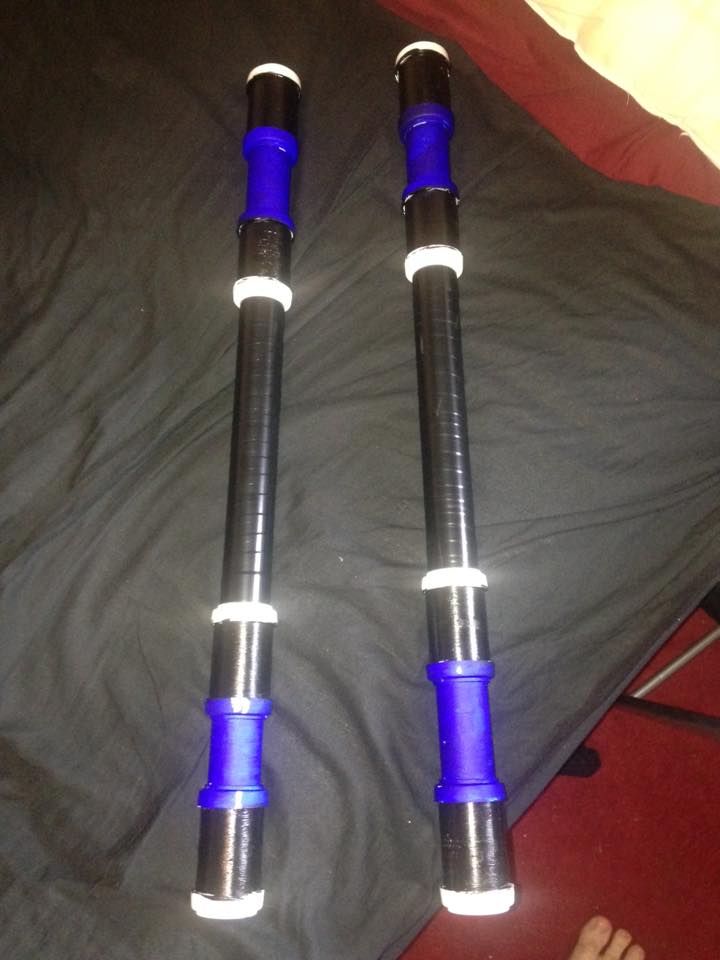 Now unfortunately I am not cosplaying Thor so I can’t simply harness the power of the gods and generate electricity into my batons. The only option really is to paint the electricity part blue and that will do the job. I painted all of my connectors Black, and the gap I had made between each connector was painted blue. For the handle part I took some black electrical tape and wound the tape from the top to the bottom in a coil. The black tape not only stands out between the paint but also the tape offers a much better grip of the weapons.