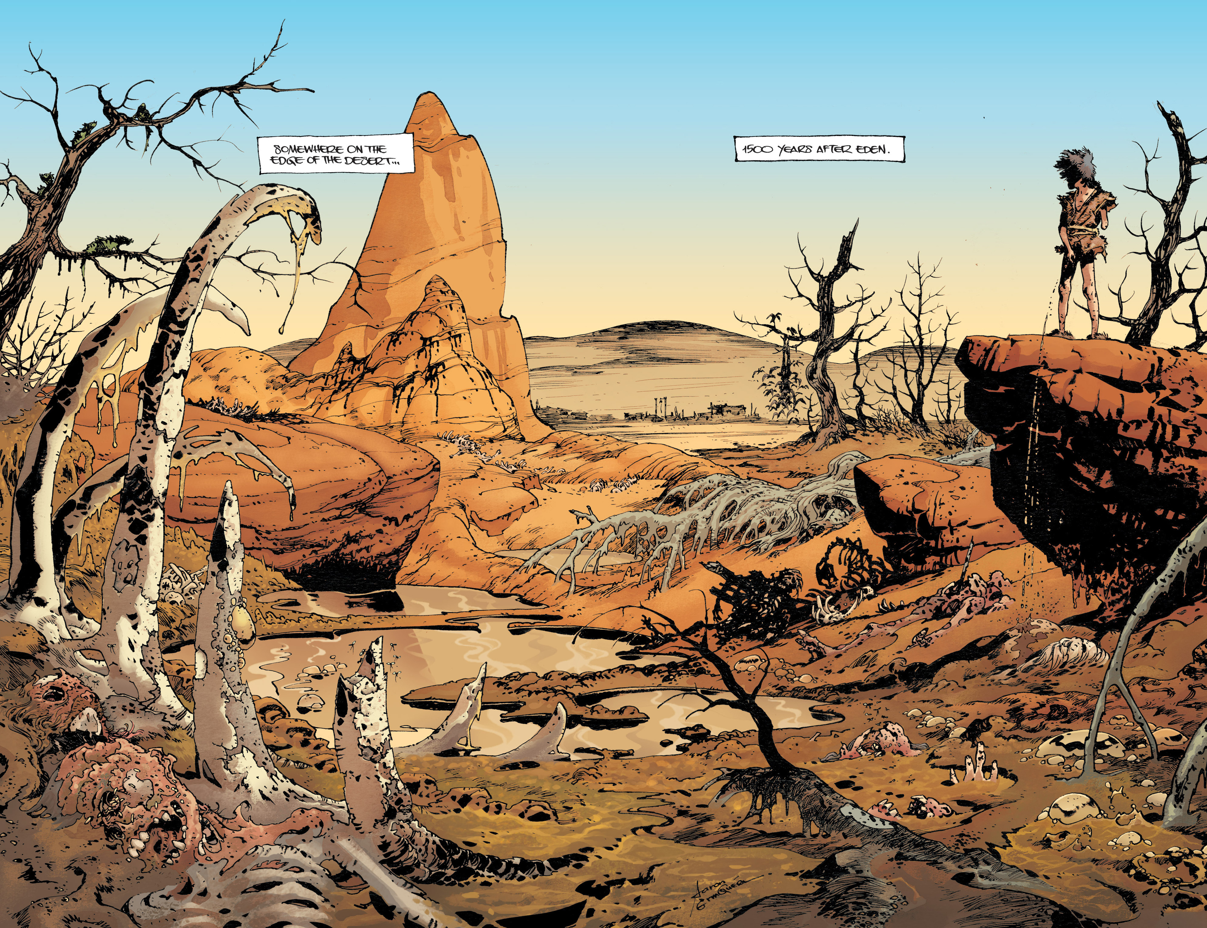 Set 1,600 years “after Eden” in a world filled with wanton cruelty, disease and violence – a world completely forsaken by an angry, disappointed God – this new series from Image Comics hits you right from the very beginning with the sheer visceral nature of its storytelling. Naked, covered in human excrement and furious at a God that seems to be punishing him personally, a mysterious stranger awakens face-down in the “shit pond” with nothing but vengeance on his mind. This isn’t your grandma’s bible story, folks.