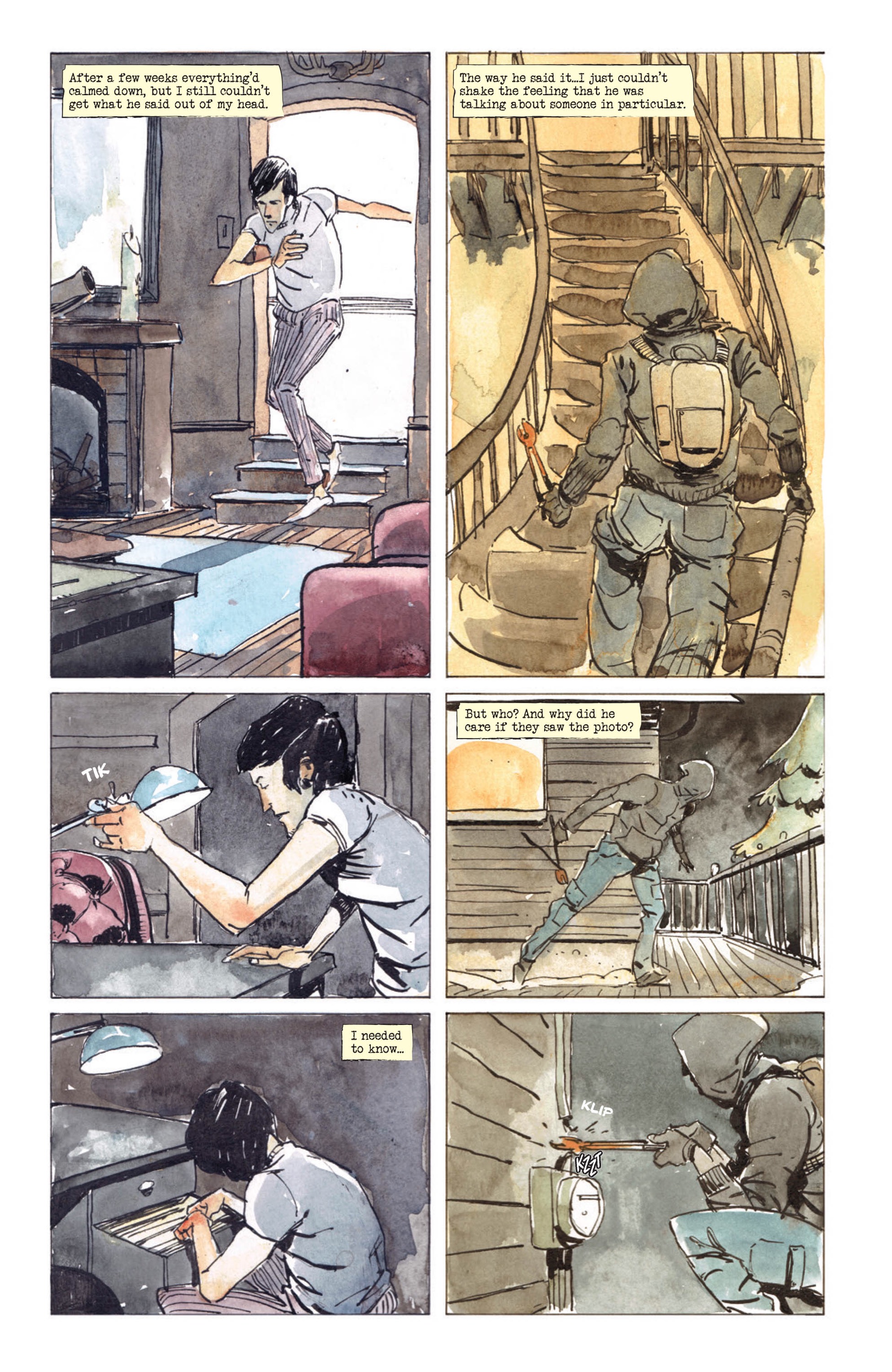 TYLER JENKINS: The decision to use watercolour was a direct reaction to the script. I would say more specifically, the decision to use watercolour in this way, is a direct reaction to the script. Watercolour is quite a versatile medium, but the moody swirling blending of colours allows for a moodiness that is very challenging to capture in other mediums. I think, for me, watercolour allows me to bring in a certain amount of ambiguity and subtle vagueness that is perfect for crime stories.