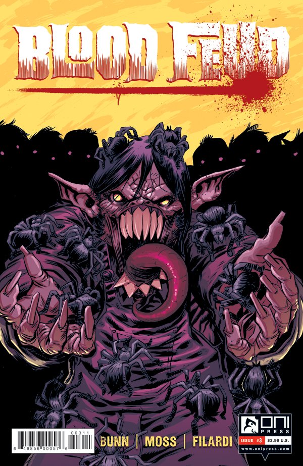 With its alternative cover pages that mimic iconic posters for classic horror films, it is clear from the outset that Blood Feud is a mini-series created by horror fans for horror fans. The third instalment of the series features a wonderful alternative cover, designed by Dylan Todd, that presents the vampiric creatures from Blood Feud in the infamous film poster for Fright Night (1985), even playing on the tagline from the film: “There are some very good reasons to be afraid of the South”.