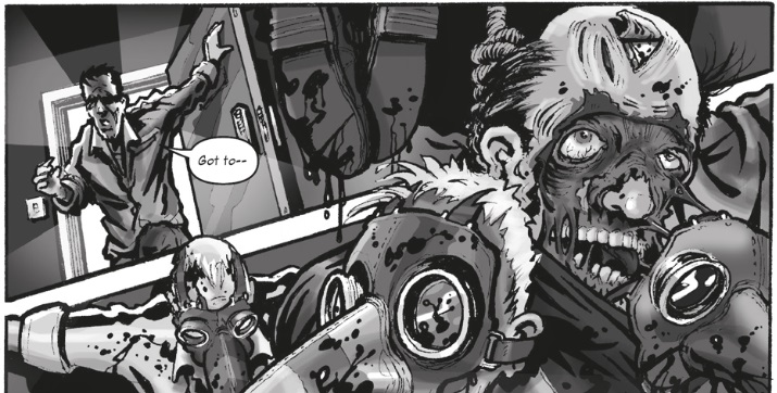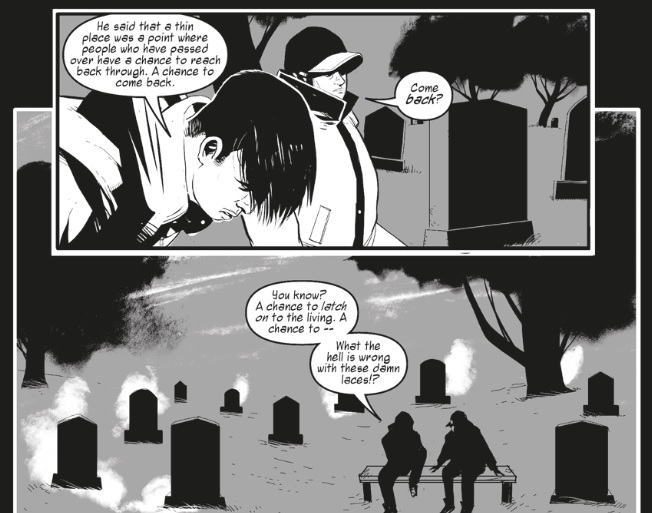 The first story, The Thin Place, is a classic horror tale with a seemingly innocuous set-up leading to a shocking twist. It follows two friends who take a shortcut home through the graveyard where one of the boys’ grandfathers is buried. One thing leads to another, and… look, I really can’t say too much about this one without spoiling the ending, but suffice to say that the premise of the titular “thin place” – a place where the lines between living and dead are weakest, and the dead sometimes have a chance to reach back through – is utilised brilliantly. The artwork is provided by Neil Ford, and once again his distinct, highly-stylised approach works well to underscore the genuinely unsettling story. A strong start then, and a deeply sinister tale that benefits greatly from the more serious approach utilised by “Sambrones”.