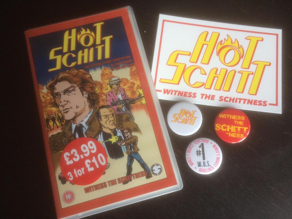 In the world of small press comics, it can sometimes be difficult for a new title to stand out from the rest of the pack. Thankfully, that’s clearly not going to be a problem for Hot Schitt, a glorious comic pastiche of 80s action move excess from Gordon Johnston. In a marketing masterstroke, Johnson has packaged this 20 page one-shot as a classic VHS videotape (see below), complete with sleeve art, typically over-the-top blurb and – as you’d probably expect – a well-earned 18 rating.