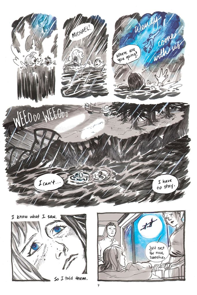 The Wendy Project also features some of the best use of colour that I’ve seen in a long, long time. The bulk of the story is rendered in a traditional grayscale, but the pages are punctuated by flashes of colour which add extra context and symbolism to the proceedings. The colour is used sparingly to highlight anything that relates to Michael’s mysterious fate, giving the book an ethereal, magical quality which draws us deeper and deeper into Wendy’s story, making us gradually believe (or should that be hope?) that her explanation for her brother’s disappearance is actually true.