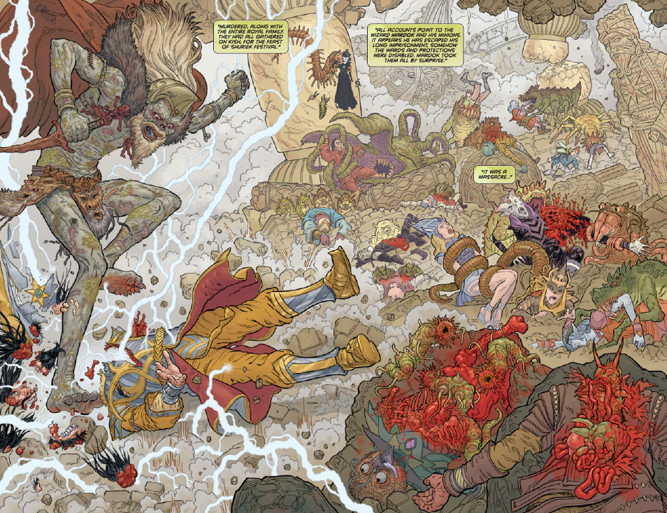 We’ll meet Death Mage, regicidist and disciple of Emptiness, Mardok, he’s kind of an eight foot zombie wizard who wrangles a horde of flesh eating insect monsters for his minions. ‘The Book Of Remaking” the Maestro’s crown jewel is stolen, it’s a spell that allows its user to remake reality in their own image, essentially making it’s wielder the one true God of a new age. It kind of a big deal. There’s Romance, action, Demon Kings and destruction on a planetary scale and much, much more.