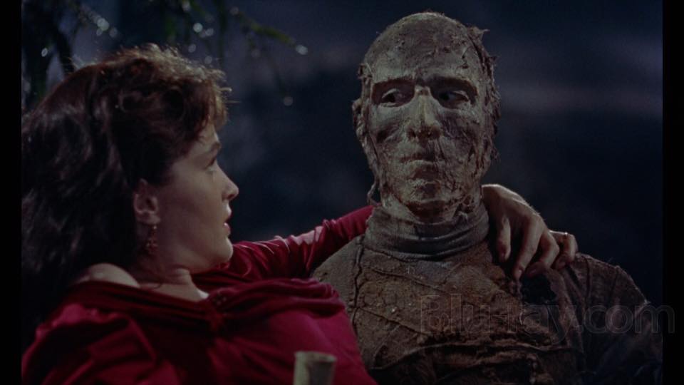 With the exception of a lengthy flashback telling how Kharis became The Mummy (his love of Ananka led him to attempt to raise her from the dead, a blasphemy resulting in his tongue being cut off before being condemned to a living death) Christopher Lee spends the entire film acting in silence with only his eyes to convey any character.