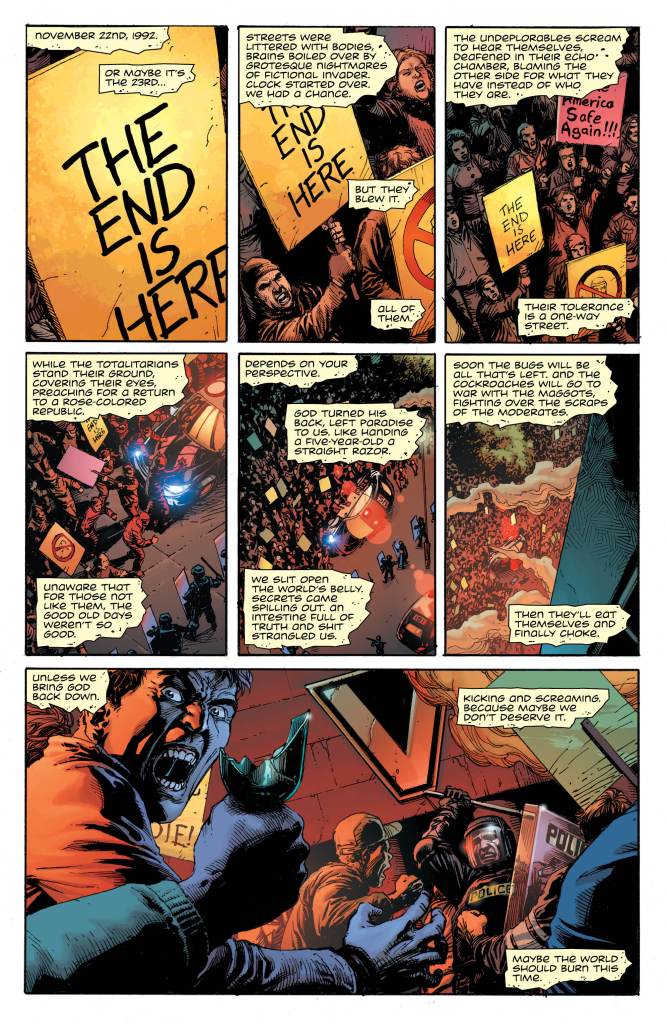 First off, there are definitely some interesting ideas at play here. And while a lot of it falls into the realm of “setting Watchmen in the terrifying modern day political climate”, the (apparent) return of Rorschach and the ambiguity of his actions helps keep the pages turning here.