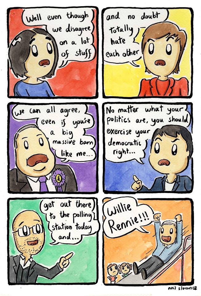 NEIL: Accident, like most stuff! I’d done some stuff during the Independence Referendum and for anthologies and then, in the General Election, I just started drawing along with the debates, rip it a bit and tweet them out. That got a lot of traction and people like Nicola Sturgeon would get in touch, and then STV got in touch to ask if I could live-draw the election coverage, and that kept going for about a year or so. There was a big shake-up at STV – and I guess cartoonists were first to go! – but then the National picked me up, and I’ve been doing that for the last year. There a lot of hard weeks but it’s great, having a regular reliable income is like gold dust.