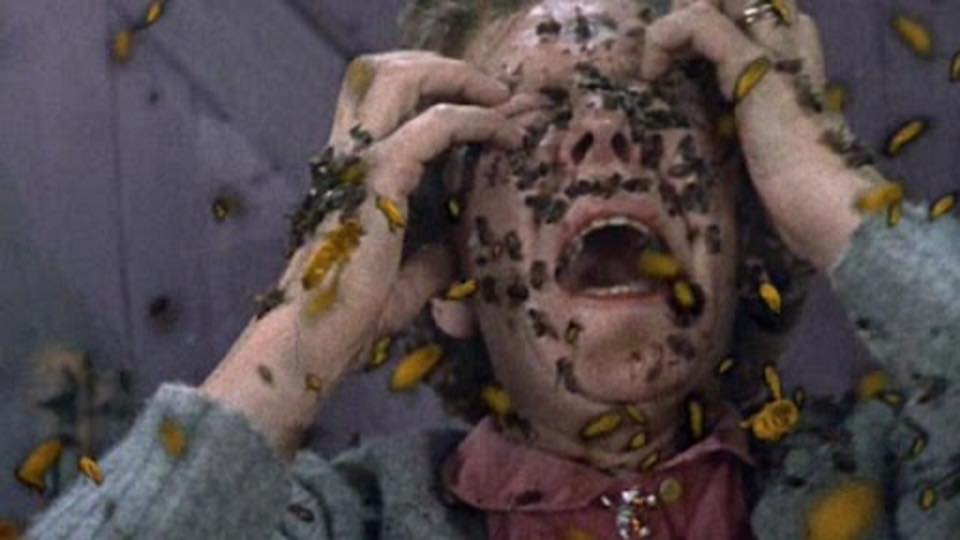 Naturally it’s the bee attack scenes that do the damage here and they’re pretty well realised. The overlay effect when people (or animals) are being stung to death is poor, but the intense close ups of real bees stinging coupled with the fake ones stuck to the actors build up a convincing illusion of what must be one of the worst deaths imaginable.