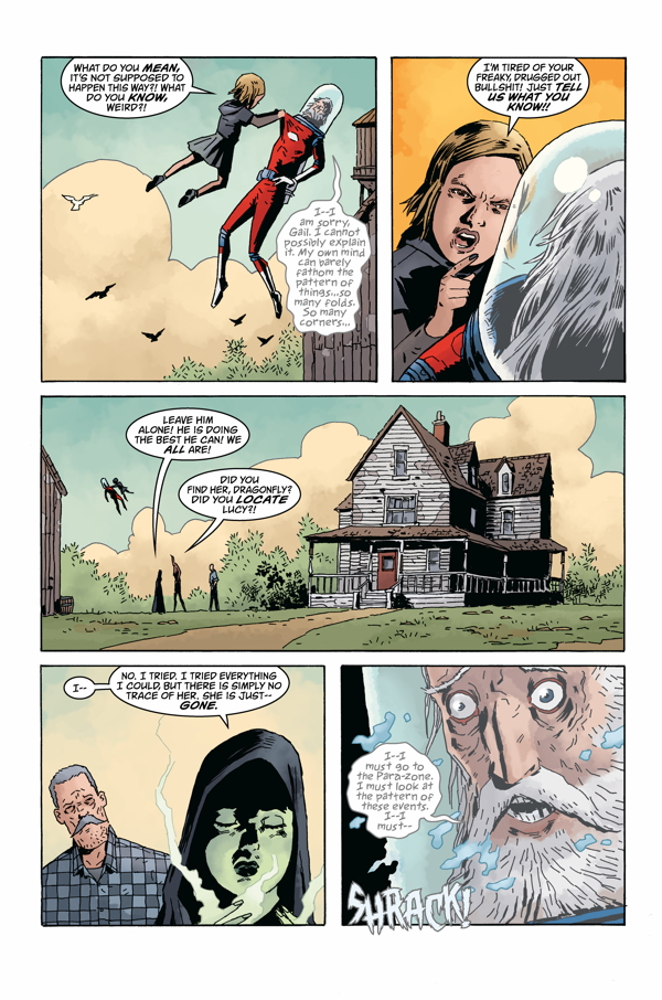 After the opening sequence, the story forks off into two separate narratives; one with the heroes in the farm trying to work together to figure out what happened to Lucy, and the other with the All-New Black Hammer trying to come to terms with… well, you’re just going to have to read the issue for yourself. Sorry. No spoilers here, folks.