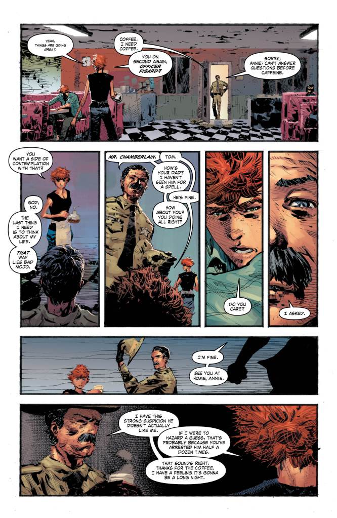 This is a slow burn (no pun intended) of an opening issue, with Jordan and Tan taking their time to introduce us to our protagonist Joe Chamberlain and the town he calls home. York Hills is like hundreds of other rural American towns dotted around the country, struggling to survive following the loss of its primary industry – in this case a coal mine – and ending up as nothing less than a trap for its younger generation who are forced to grow up without any skills, money or prospects.