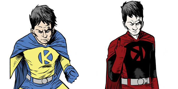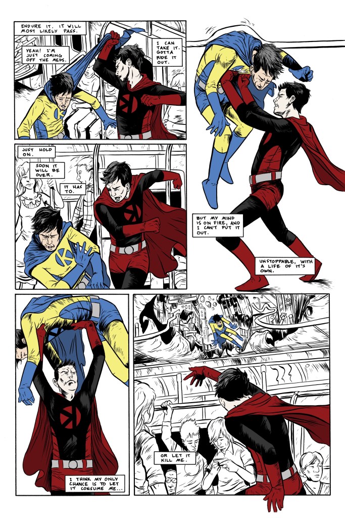 The story is based around the title character, Kaleb, who suffers from a pretty serious anxiety disorder. However, this anxiety manifests itself in the form of two superheroes, one good, one evil, who following him around and serve as a visual and visceral manifestation of his emotional struggles.