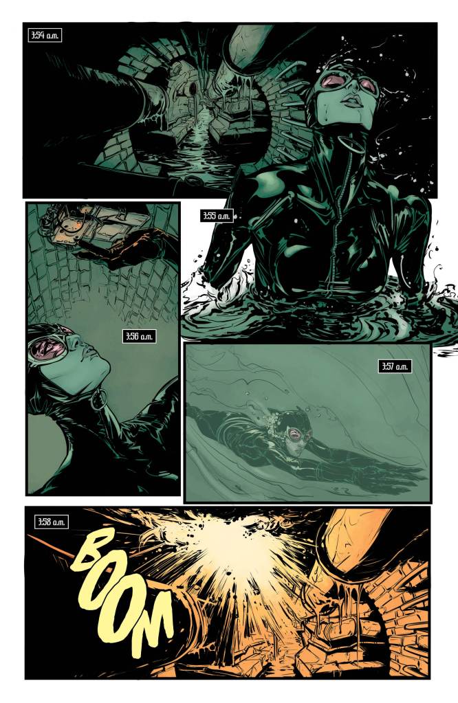 June Chung and Jordie Bellaire do a great job of bringing a sense of authenticity to the colours of each flashback era, and of breathing life into the costumes of the time. The sequences set in modern day following Catwoman’s solo “adventure” are bathed in dark blues and blacks to signify the night, which helps draw a contrast to her memories of the past.
