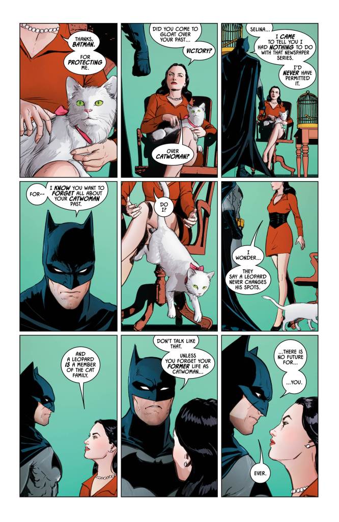 Every now and then, Tom King likes to slow down the arc he is writing and take us off to one side to develop a character or idea that he wants us to focus on. This issue focuses on Selina Kyle as we take a trip down memory lane, witnessing the Bat and the Cat in various stages of their relationship.