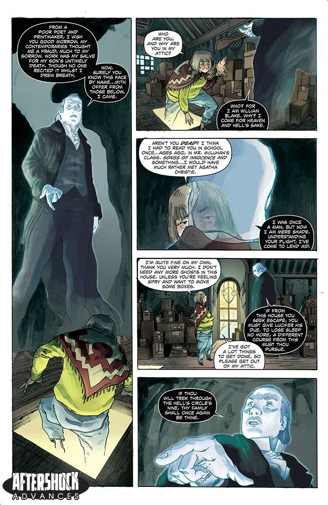 The opening pages introduce us to our leading lady, a middle-aged mother struggling to come to terms with her grief following the loss of her family, and see her visited by the ghost of William Blake, who offers her the opportunity to save them by making her way through the nine circles of hell. As you do.