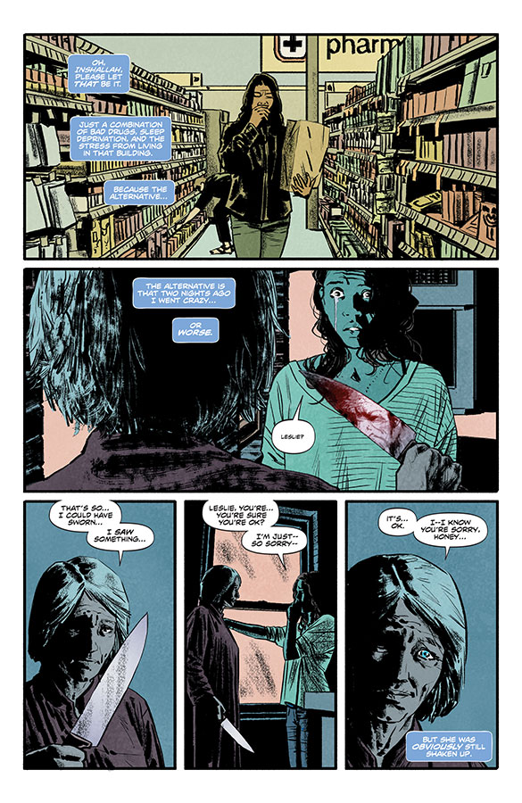 After the cliff-hanger of the first issue, we’re brought back to mundane reality. The story jumps to a conversation between Aisha and her doctor about how her medication might be causing her sleep troubles and ‘visions’. Campbell and Villarubia maintain their form with the quick shifts from the muted colours of the real to the all too vivid and gruesome apparitions that plague Aisha’s building. Creating tension in a horror film is difficult enough when you have the benefit of a complimentary musical score, but to be able to do so in a comic takes real talent, and yet the team here seem to do it with ease.