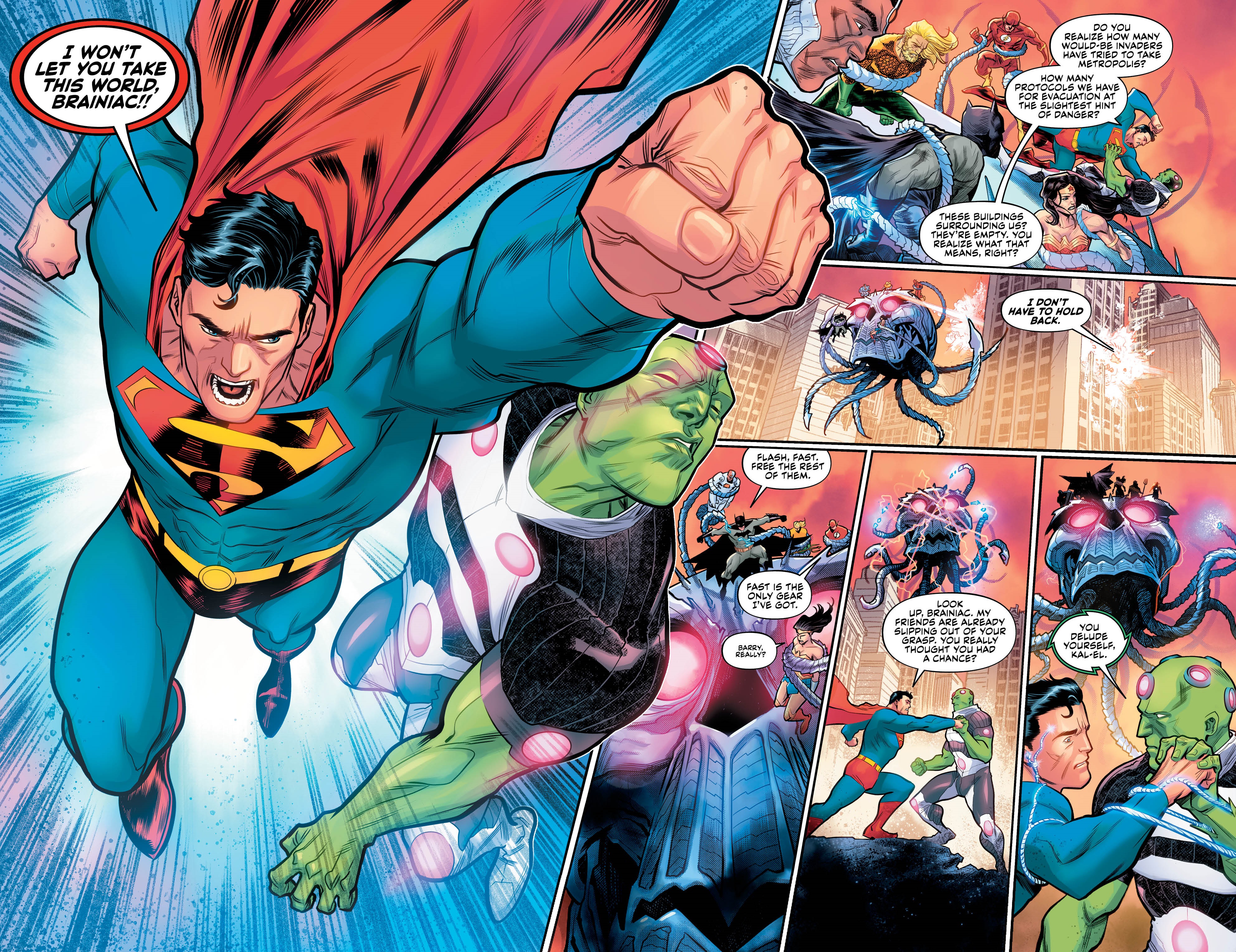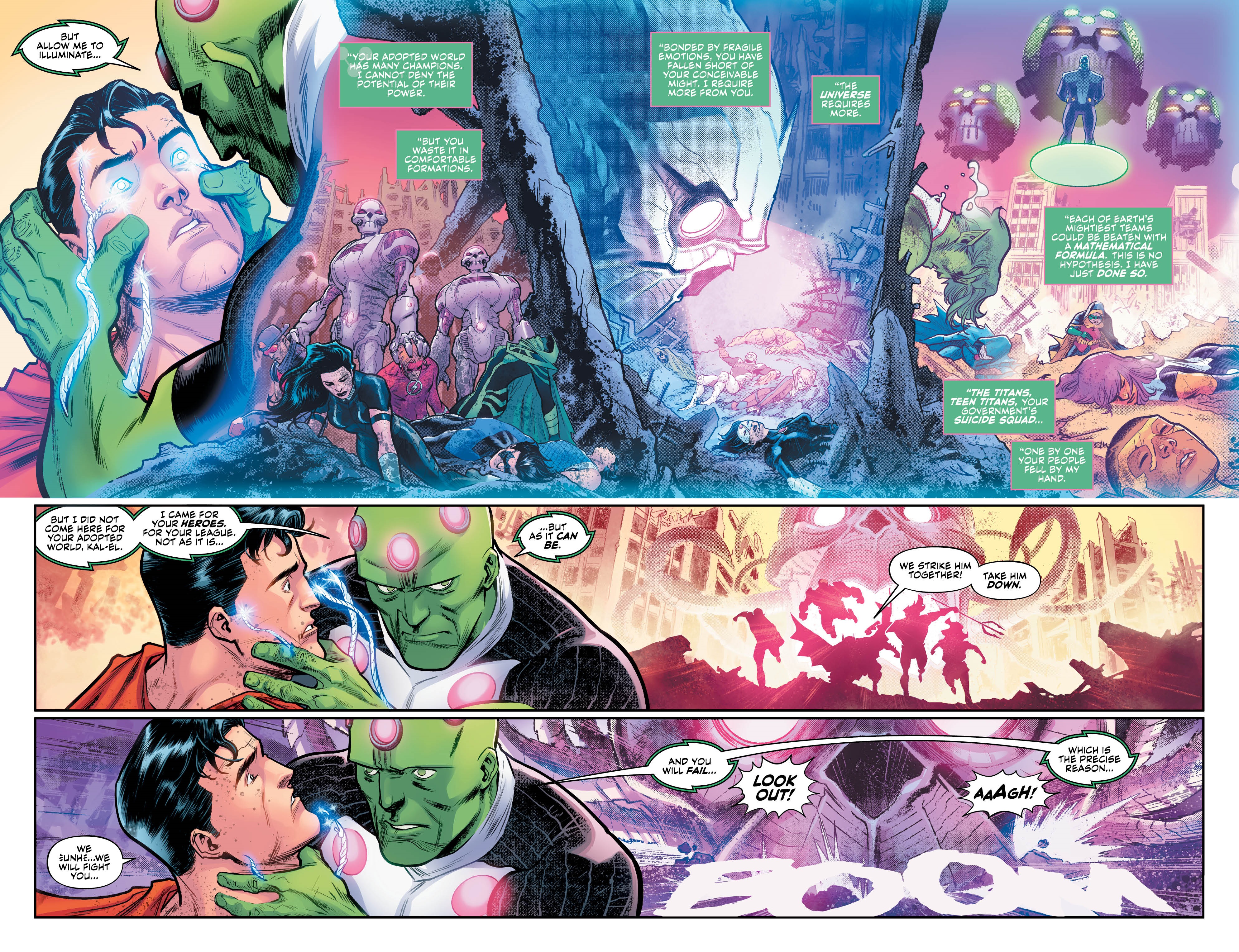 Having three separate writers on a single issue is always going to raise a massive red flag, but the collaboration between Snyder, Tynion IV and Williamson feels natural and fluid here. There’s a massive cast of characters, and as such, nobody really steps up as the main focus – aside from Braniac himself and the somewhat counter-productive Amanda Waller – but this approach actually works well to accentuate the epic scope of the event, laying out the key players before splitting things down into smaller groups.