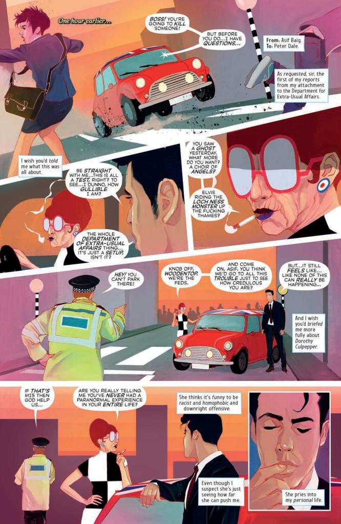 Issue 4 starts with a cliff-hanger and keeps you on edge for the rest of the issue. The narrative jumps effortlessly between Fergie and Sid trying to break up a pensioner rave and Asif’s monologue/report of Culpepper to his superior, while also giving us glimpses of the other characters on their interlocking journey.