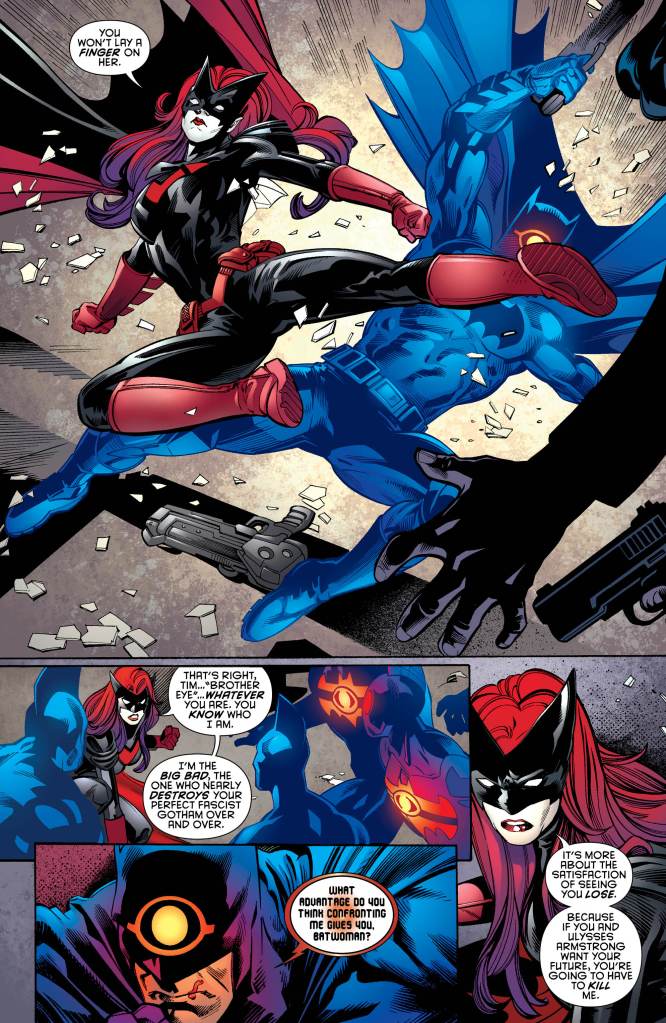 Tim Drake leads the assault on the allies of the Bat while under the control of Ulysses and Brother Eye. Elsewhere, Batman and Batwoman team up in a desperate plan to stop the dark future Saviour envisioned from becoming a reality, only to realise that they can’t do it alone.