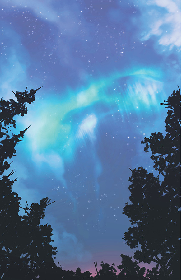 It’s the unique visual style and atmospheric colors that immediately set this book apart, bringing so much depth to this ethereal tale. This approach is taken to the next level again this issue, particularly during the jaw dropping double page spreads of its opening locations. Bright colors and attentive focus to lighting show the warmth of the forest, and the cold hues of the wasted town fraught from war and suffering. Every inch is filled with small details that cascade this world with history.