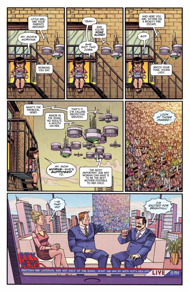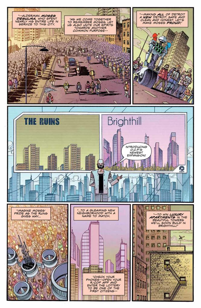 We begin with an unnamed radio presenter – presumably an illegal/underground broadcast – reminding us that once Detroit had heroes, specifically one shiny Robocop-shaped hero, now sadly lacking. We fast-forward to a public gathering and a funeral march for a fallen public figure, unceremoniously offed in issue #1, before immediately cutting to our intrepid CEO unveiling another stage in the plan to literally burn down old parts of Detroit and rebuild gleaming spires from the ashes. Disappointingly, we only get one throwaway reference to the R/cop app from the previous issue that had me so intrigued.