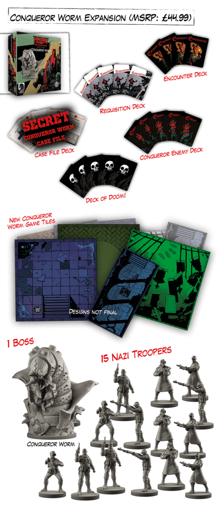 The Conqueror Worm Expansion gives a whole new quest and a whole lot of Nazis to take out, plus the worm itself. With new tiles to explore, new requisitions and encounters, this hugely expands the play experience in the same vein as the initial TWD sets (check out our reviews here).