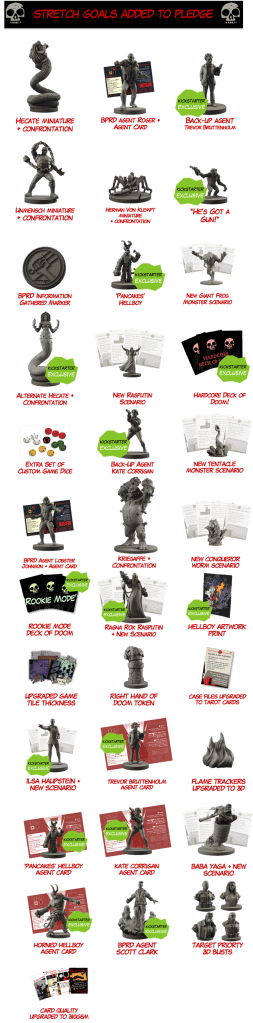 Hecate, Unmensch, Herman von Clempt, and Crieggaffe (all with rules for Confrontation); Ilsa Haupstein and Baba Yaga (with Scenarios); extra scenarios for Rasputin, Tentacle monster, Giant Frog, and Conqueror Worm; 3D tokens for BPRD Information, Right Hand of Doom, Target priority and Fire; extra dice and upgraded tiles and cards; Rookie/Hardcore mode decks; and Agents Trevor Bruckenheim, Roger the Golem and LOBSTER freaking JOHNSON!