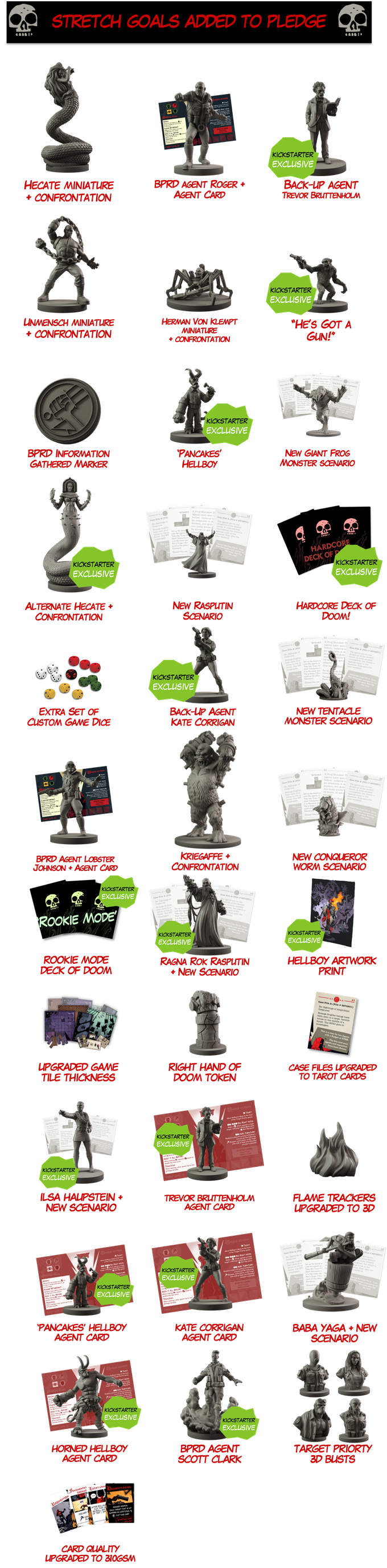 Hecate, Unmensch, Herman von Clempt, and Crieggaffe (all with rules for Confrontation); Ilsa Haupstein and Baba Yaga (with Scenarios); extra scenarios for Rasputin, Tentacle monster, Giant Frog, and Conqueror Worm; 3D tokens for BPRD Information, Right Hand of Doom, Target priority and Fire; extra dice and upgraded tiles and cards; Rookie/Hardcore mode decks; and Agents Trevor Bruckenheim, Roger the Golem and LOBSTER freaking JOHNSON!
