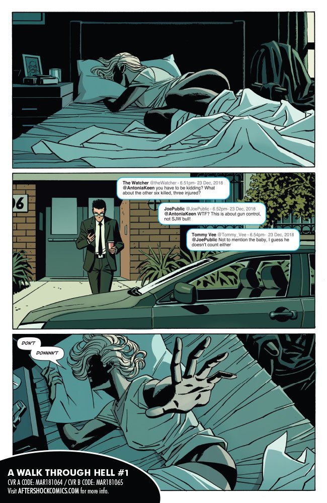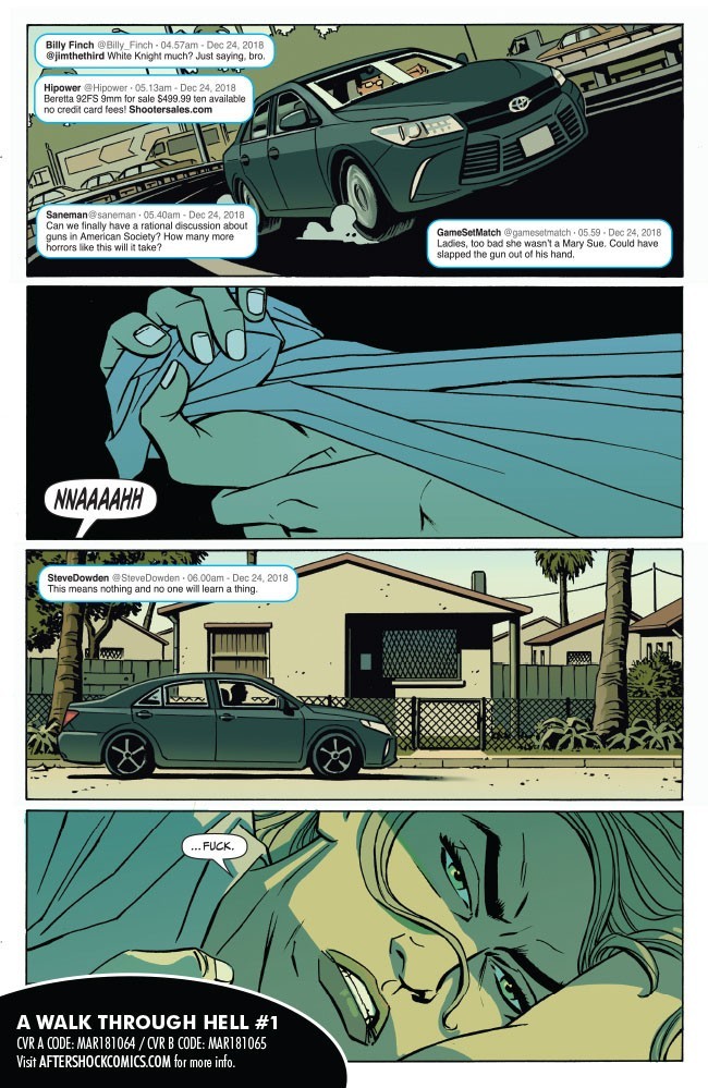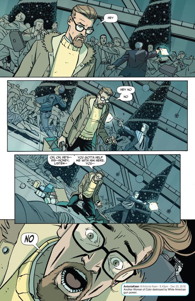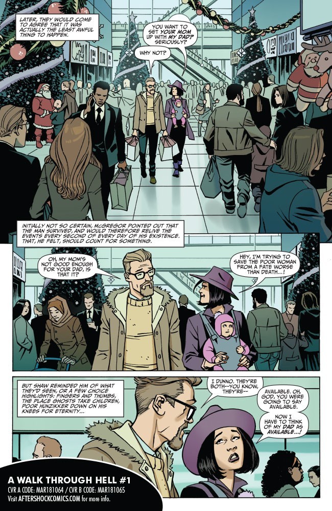 A Walk Through Hell begins with a bang and the typical in-your-face style that Ennis is renowned for. Opening with a young family strolling through what appears to be a crowded shopping mall at Christmas, there’s an uneasy sense that something is about to go terribly and, given the pedigree, gruesomely wrong. Over the joking chat of a woman asking whether setting up her father with her partner’s mother is a good idea, we are given some pretty grim exposition which builds to one seriously shocking splash page.