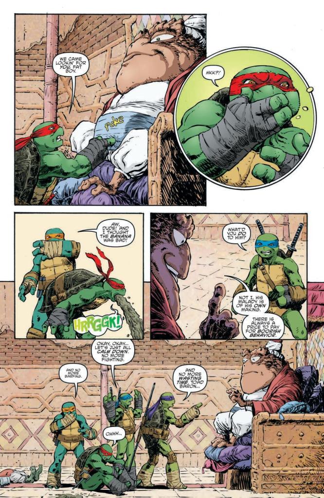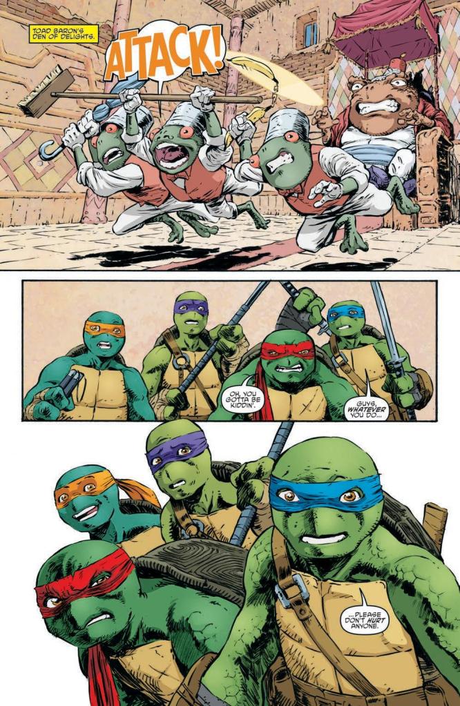 Fortunately, Dave Wachter’s artwork is the rising tide which raises all ships here, providing a striking and suitably fantastical rendition of the Toad Baron’s abode. It’s the type of light-hearted fun that the series thrives on, even though the stakes are still fairly high, and some of the running gags – like Raph’s nausea after touching the Baron’s belly – give the scenes an endearing, cartoony quality.