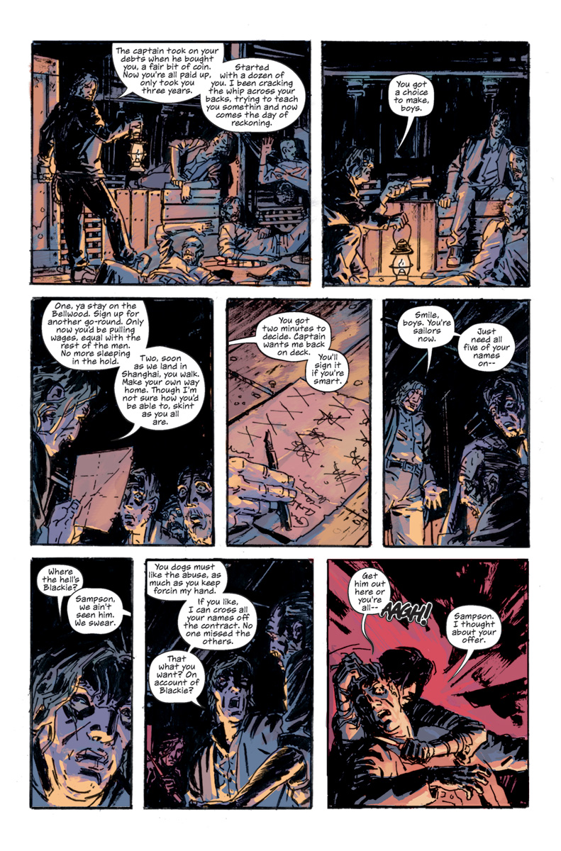 CHRISTOPHER SEBELA: Back in the late 1800s, Shanghaiing was a crime that was pretty prevalent in most big port cities. Sailors on rest between trips or just unlucky people who walked into the wrong bar would get either ripped off, knocked out or drugged and end up working on a ship heading out to sea, their signature forged on the contract and no way to escape. Shanghai Red is about one of those unfortunates who got stolen way from Portland – the shanghaiing capital of the world at one point — and is now fighting her way back home to find the men who put her on that boat. In its bones, it’s a dark little revenge story about violence, America and identity.
