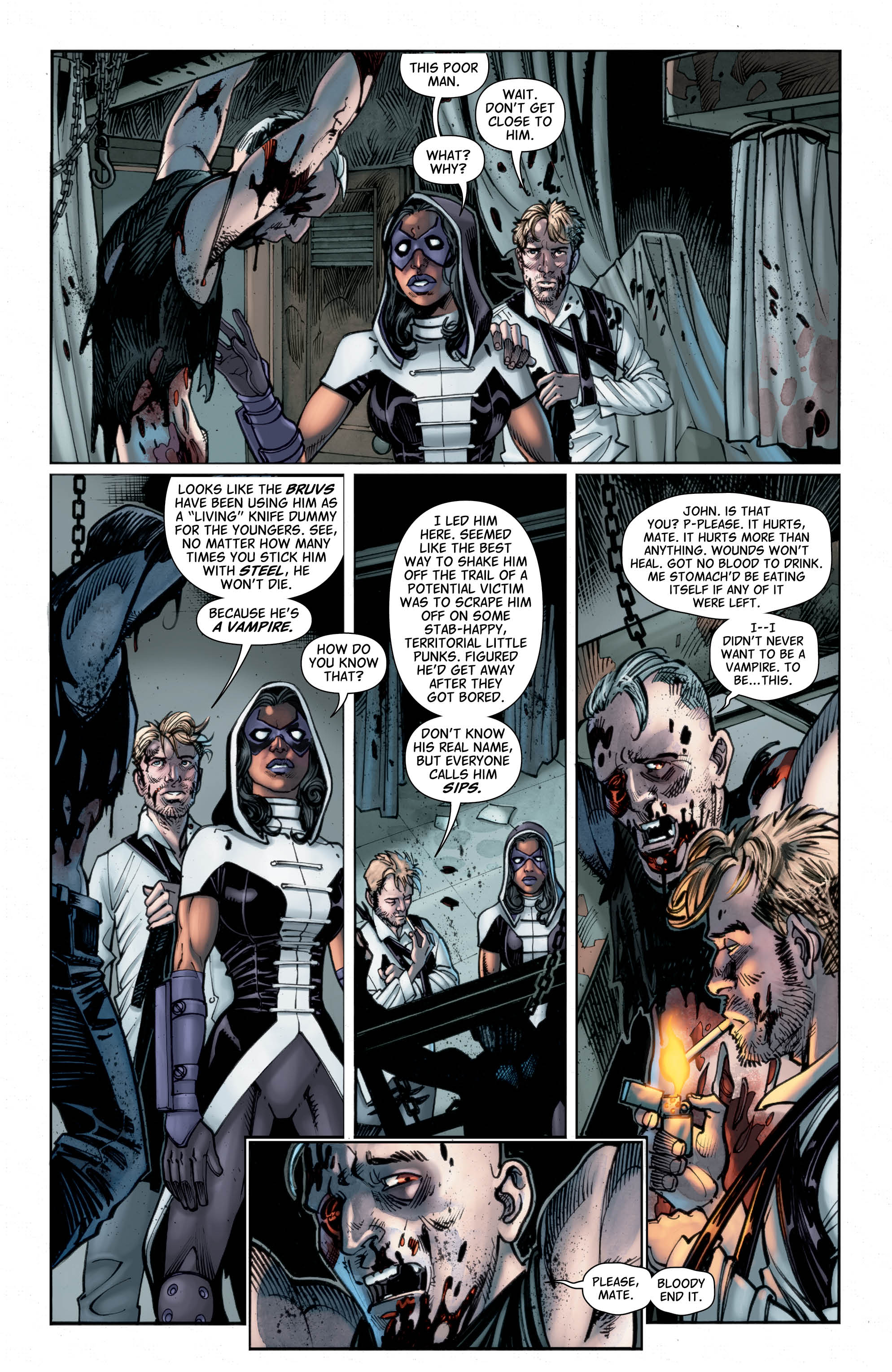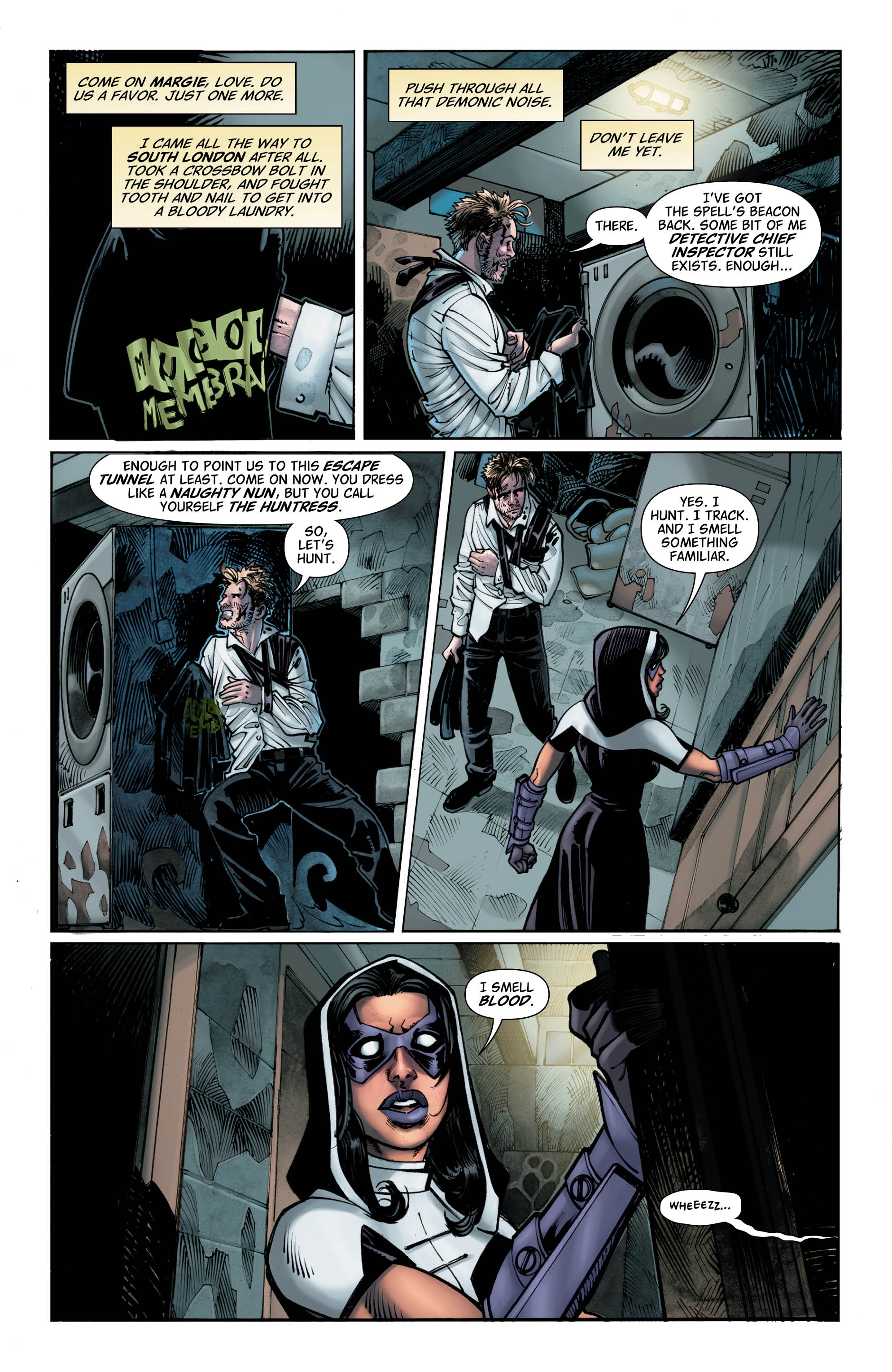 At the same time, and in spite of this impressive expansion of the character, it’s still a bloody good story to read. While we start to see Nergal’s plan with the gangster brothers of old unfurl, we also follow John, still bleeding from an arrow wound, on the trail of the devils with Huntress. Oh, and doing so while still being pursued by the gang of youths who John temporarily gave the slip last issue. There are some nice heartfelt moments in the panels too, both for Huntress and, surprisingly, for a vampire seeking salvation.