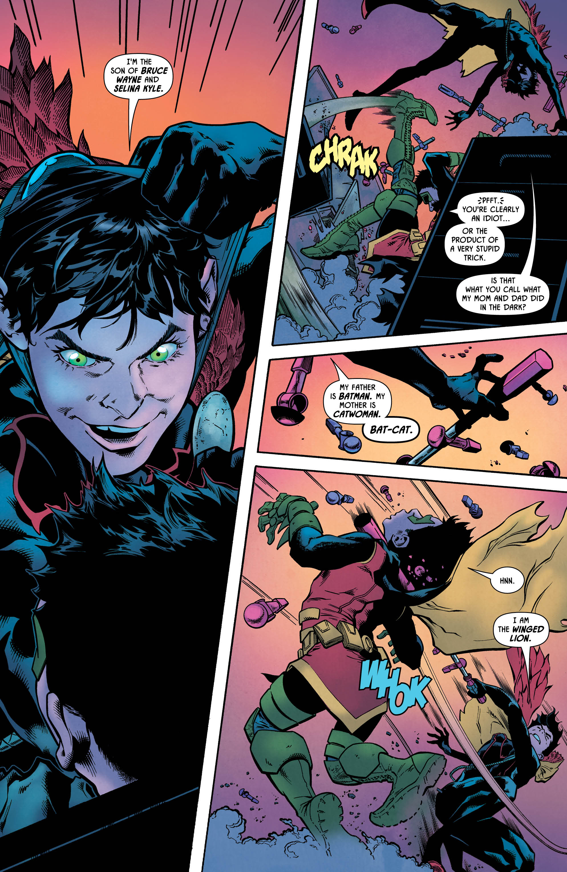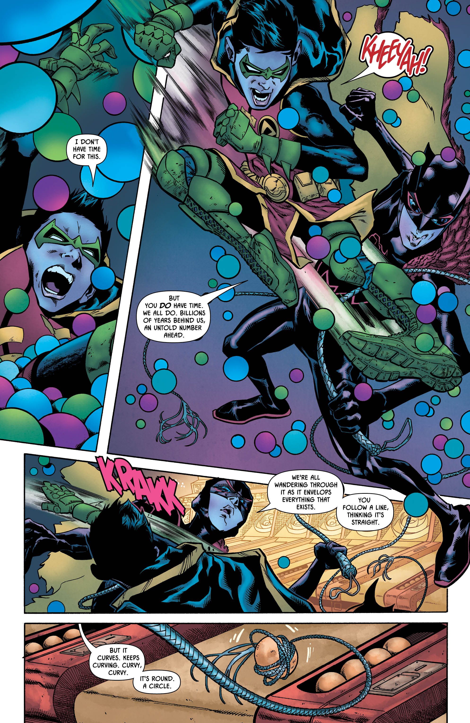 Walker’s work is helped immeasurably by the inks of Hennessey and Gray, who display a light touch that helps to give the proceedings some much-needed delicacy, particularly the scenes featuring the out-of-costume Damian and Selina. Jordie Bellaire’s colours round things out nicely, staying relatively restrained for the most part before cutting loose during some of the key moments which require some striking visual contrast. Again, it’s worth mentioning that the reveal of “Aion” and his piercing green eyes is masterfully executed.