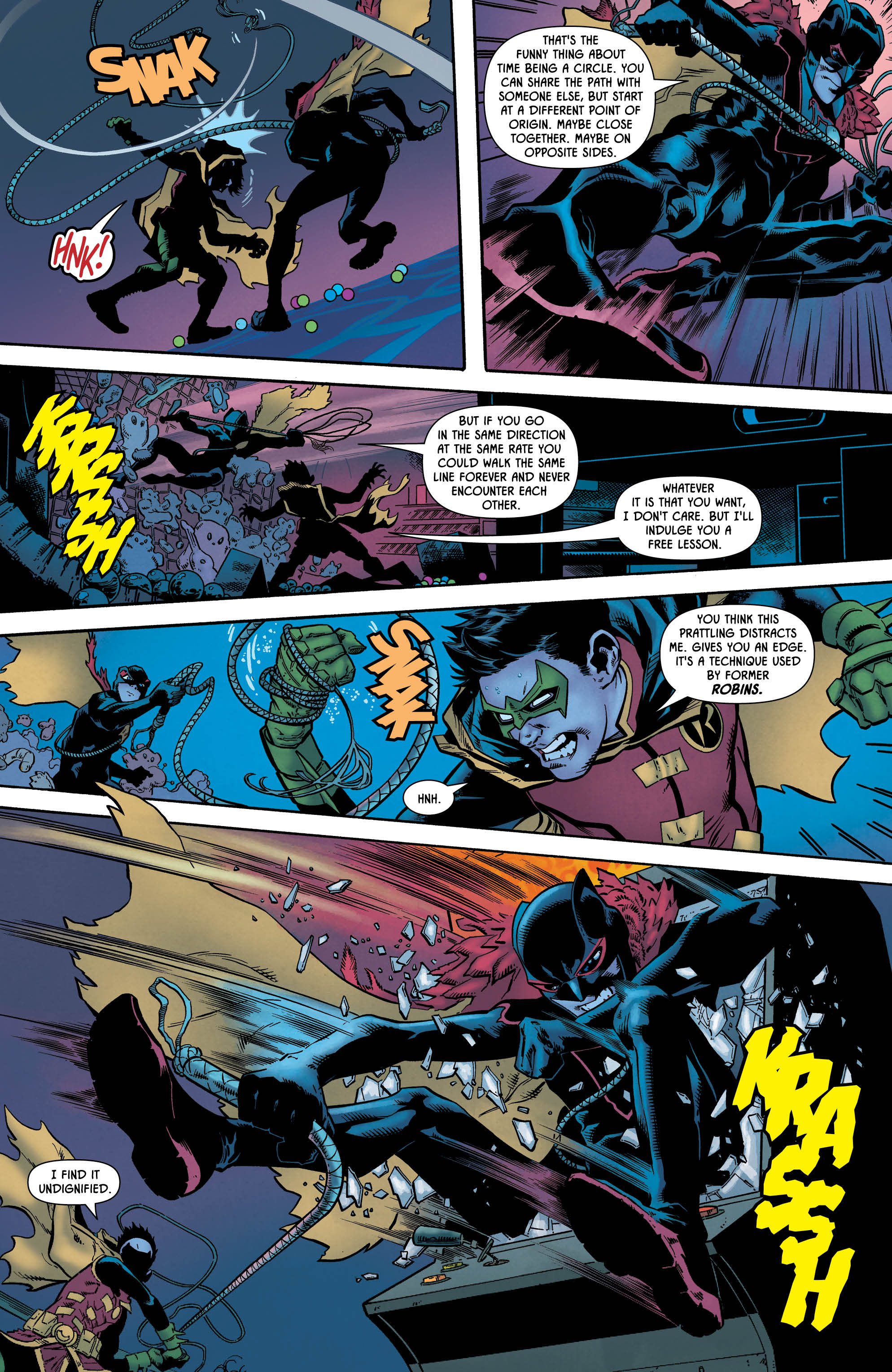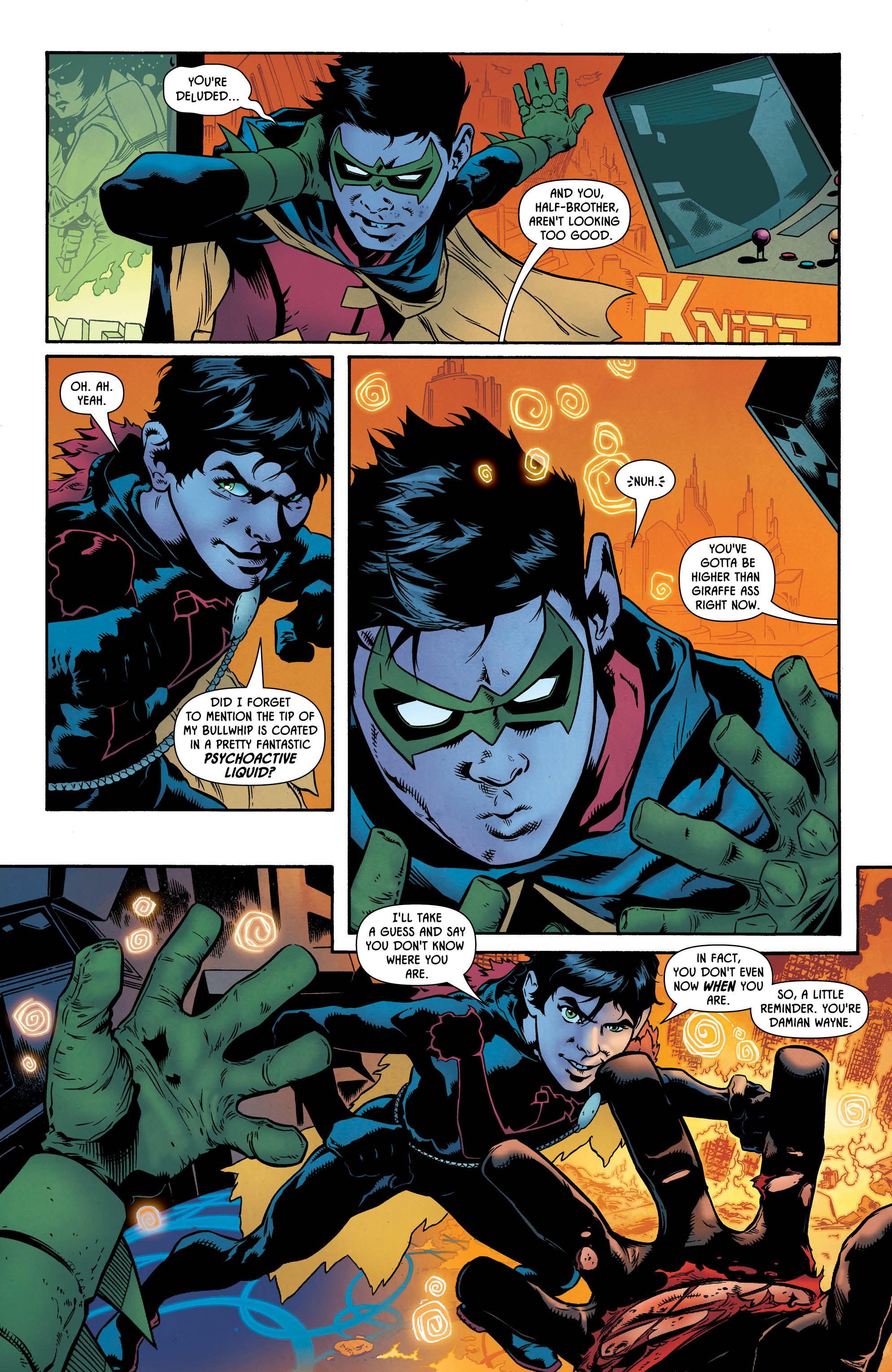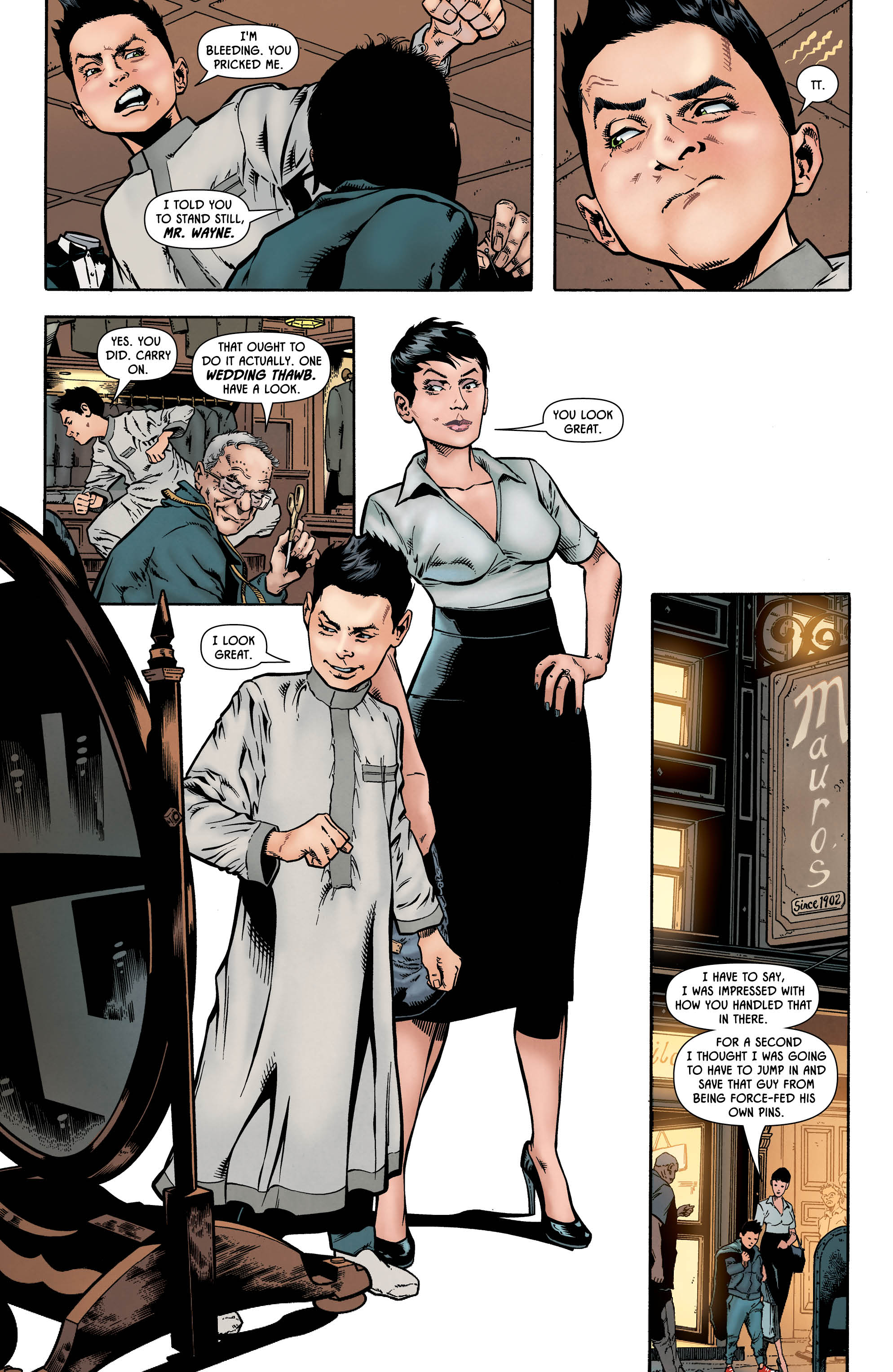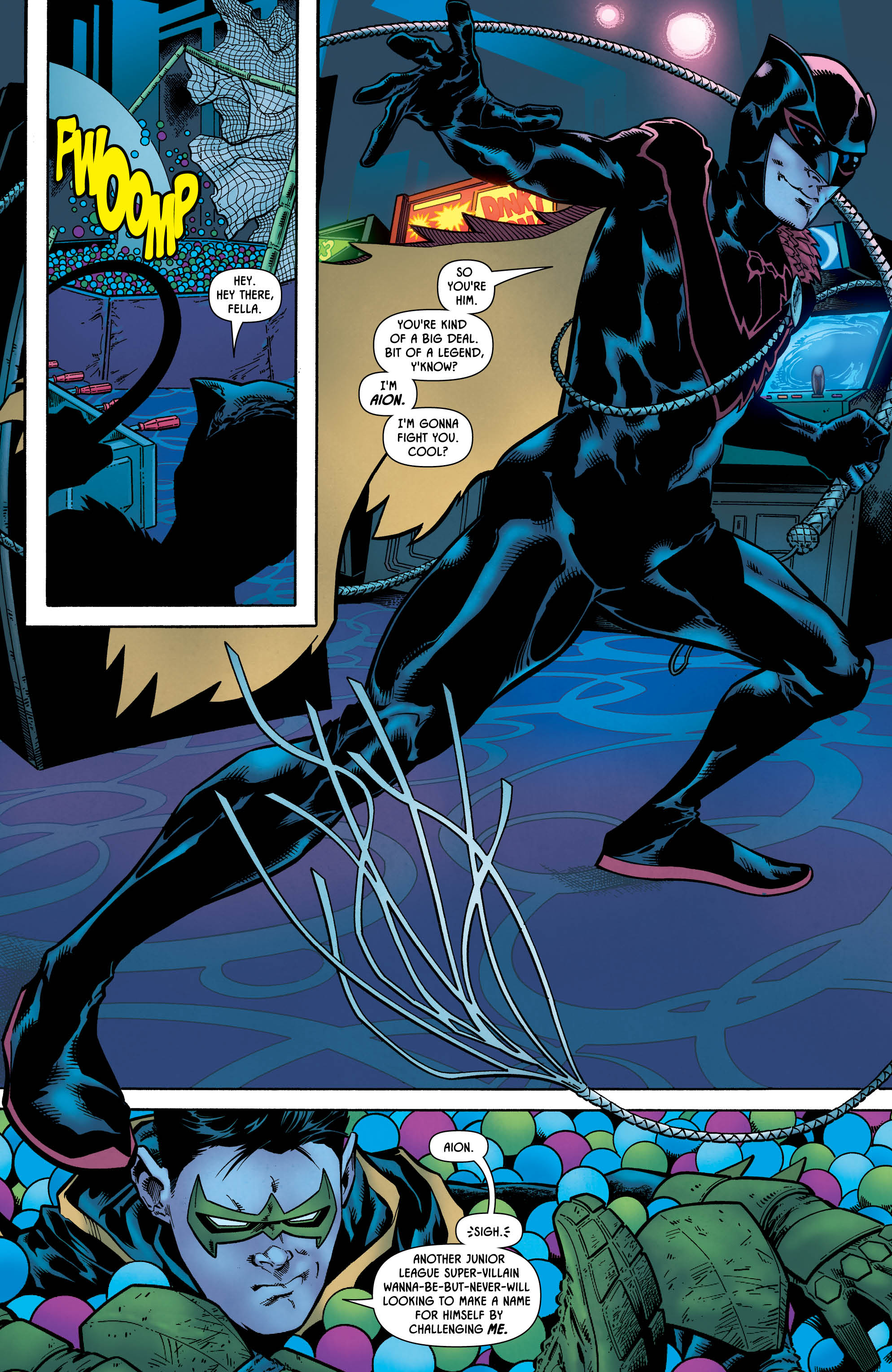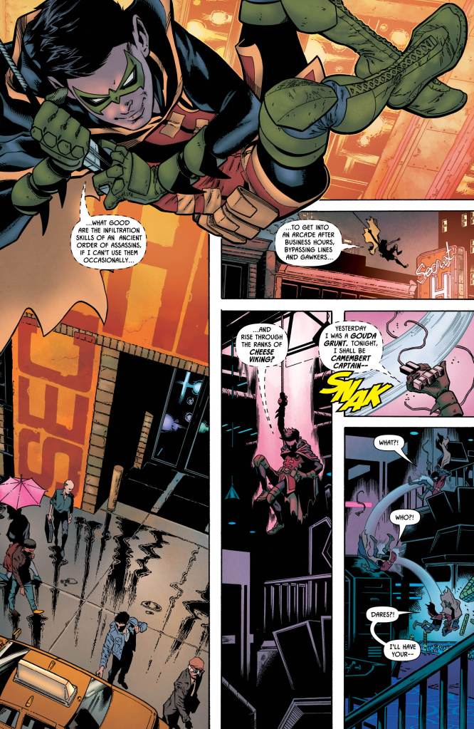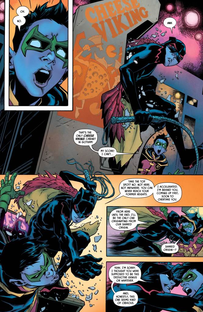 This first of these one-shots opens with Damian and Selina doing a little wedding outfit shopping, before the young Master Wayne excuses himself to pay a visit to his favourite local arcade — only to run into a family member whose identity is, let’s be honest, heavily telegraphed by both the title and the cover of this comic.