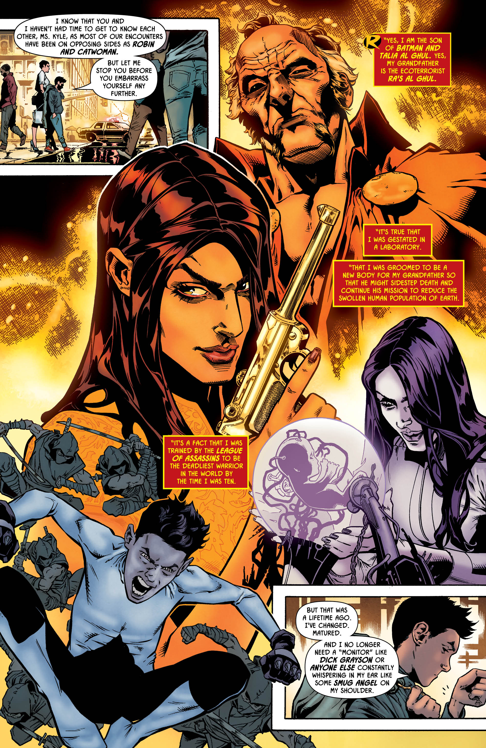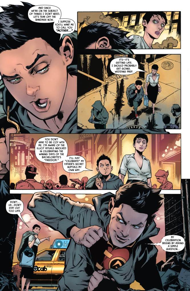 It’s perhaps odd that the actual exchange between Damian and Ra’s – and yes, there is one – is pretty much the least interesting part of the entire issue. The “Aion” stuff is cool, and suitably Damian-y, but it’s the scenes which bookmark the issue featuring the young Robin and his stepmother-to-be that really carry the weight here. Their interactions are humorous and authentic, and while the youngster is still his usual surly, tutting self, there’s a real undercurrent of charm and intrigue at play here.