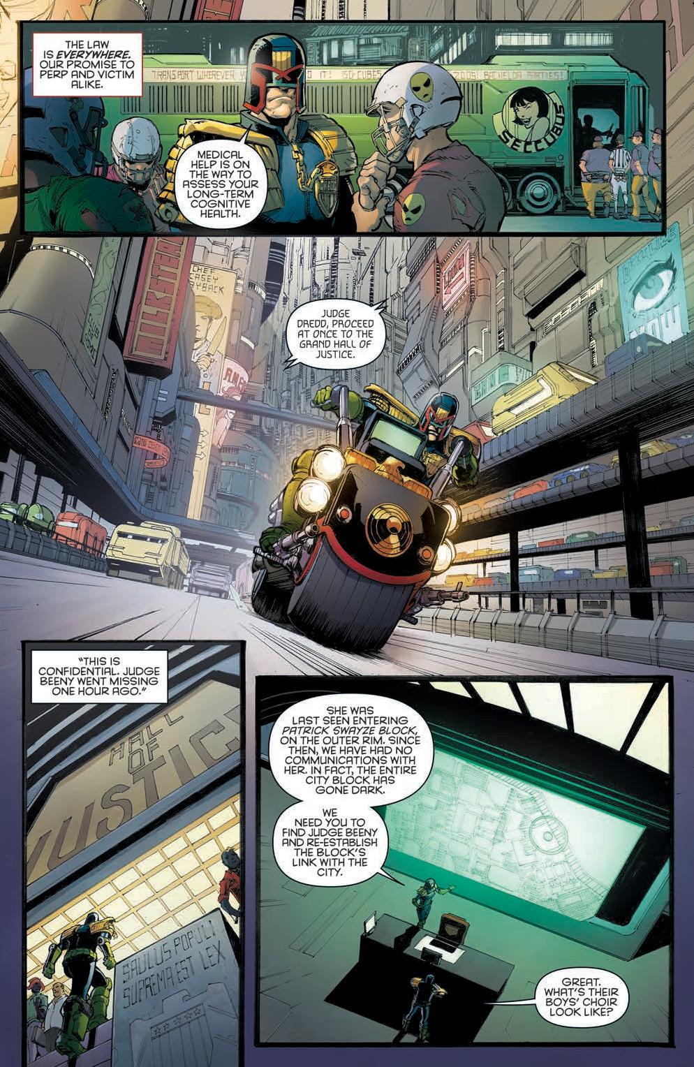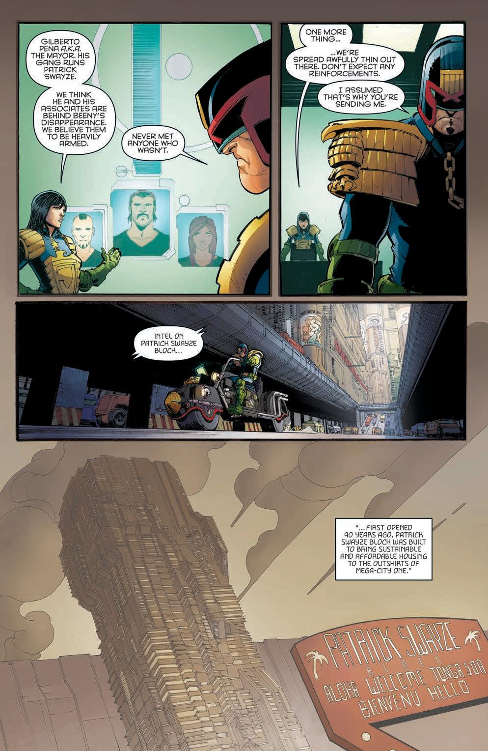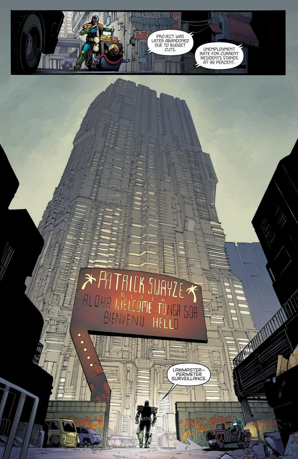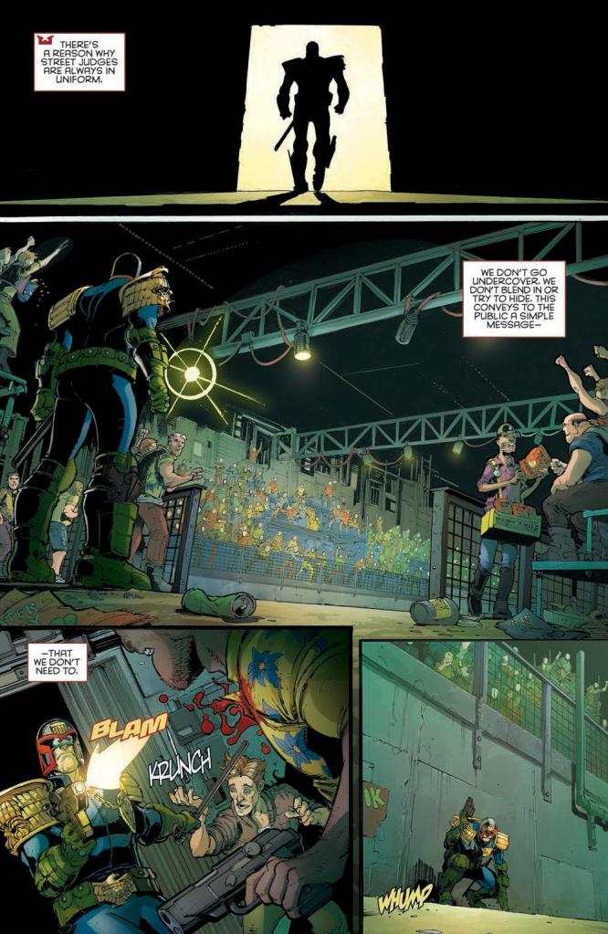 This is a familiar Mega-City One and a classic looking Dredd with a simple narrative. Namely, a presumably missing Judge in a rowdy block spiralling out of control. I mean, what’s not to like? Dredd goes it alone like the iconic stranger come to clean up the town, on a mission to assess the situation and rescue/recover his fellow Judge. It’s really nice here to see the Lawmaster get a few lines to ease us into Patrick Swayze block and all its troubles.