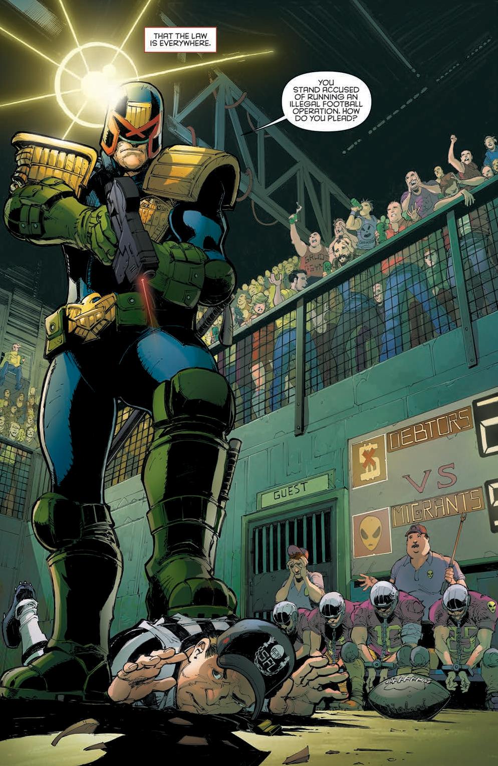 Football is illegal. Wait… football? Well, in “Under Siege” it is, and opening with such an apparently mundane bust scene both heightens and underplays the politically charged commentary at the heart of this first issue of a four-part run. The teams playing the unlawful game are the debtors and the migrants. Hmm.