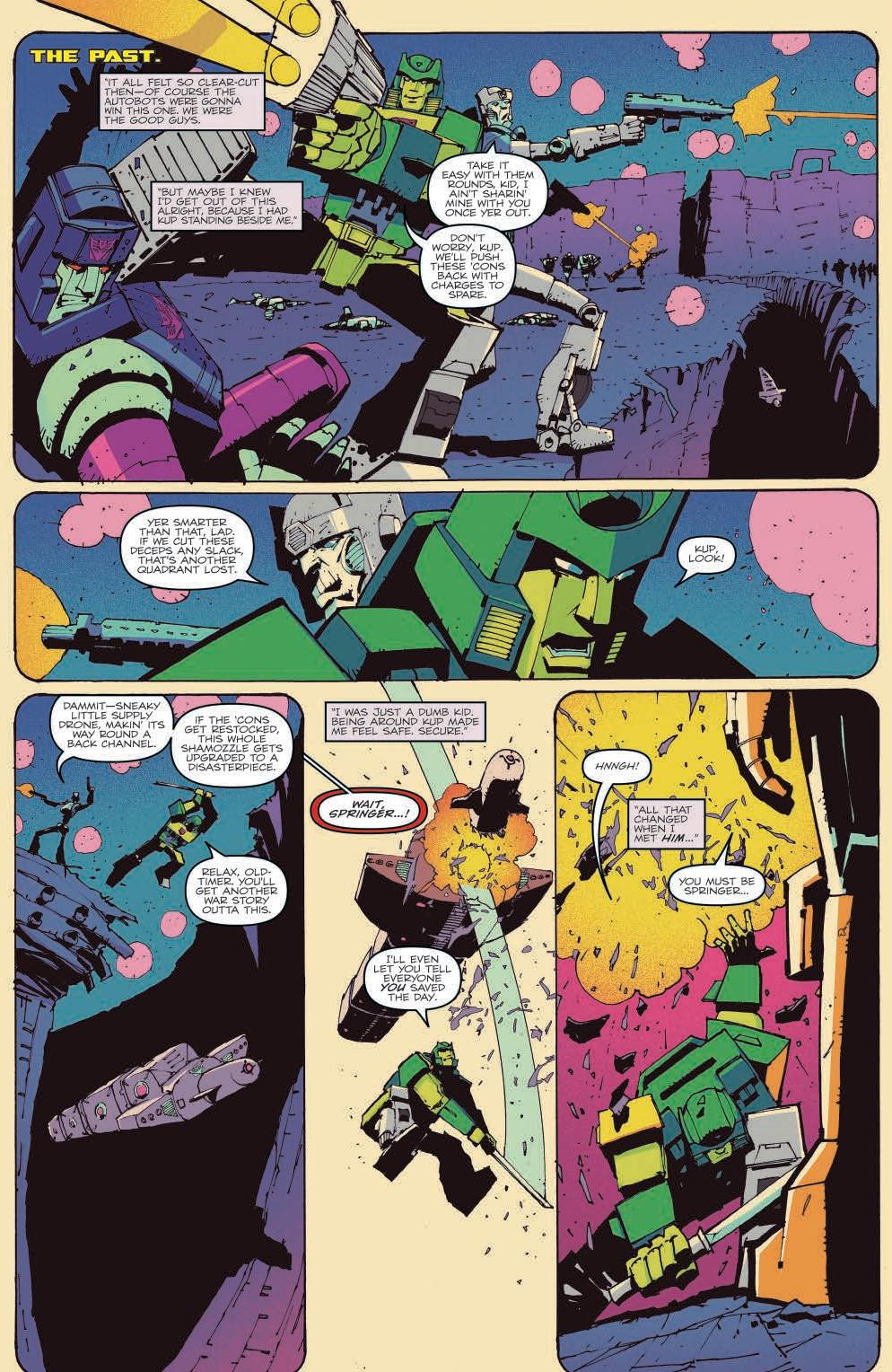 We journey to the past. In every sense. It’s 30 years ago and I’m reading Marvel Transformers comics because that’s what’s staring me in the face. A perfectly realised nostalgia trip, the artwork is so ’80s that I can practically smell the thin pulpy paper the UK comic was printed on. Kup’s dialogue is delightful – “This whole shamozzle gets upgraded to a disasterpiece” – it all feels so well realised. This is a celebration of the current comics and their past. We see Impactor recruiting Springer as he reflects on what it meant to him and his father/friend/mentor Kup and for a brief moment there’s this horrible idea that Requiem of the Wreckers could succumb to becoming little more than a greatest hits compilation. But fear not, for this is no cheap mixtape.