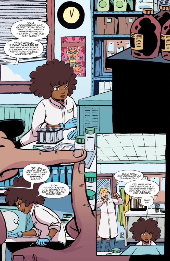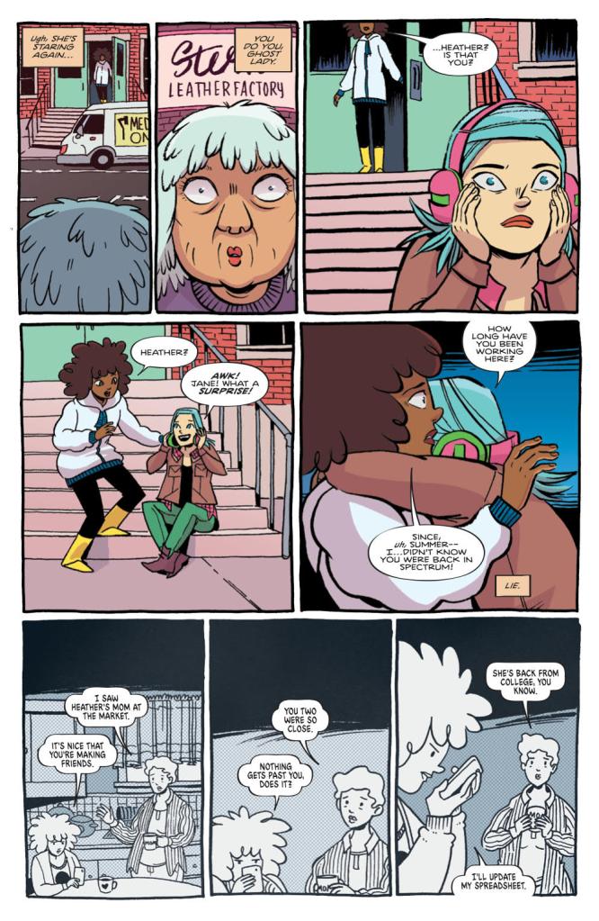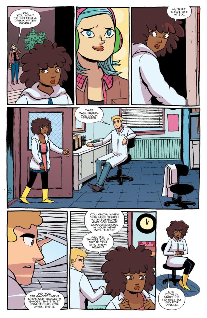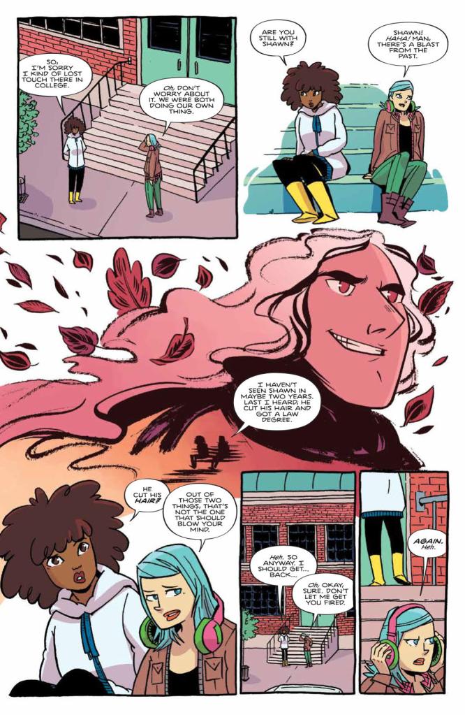 Strong, pronounced character designs and expressions for the main core of the book are intercut with different styles and framing for intertextual moments or moments in time. It’s beautiful. It also doesn’t hurt that the style shifts when things get ‘otherworldly’, providing possibly the finest treat of this issue, with colourist Sarah Stern perfectly matching the change with an insane palette.