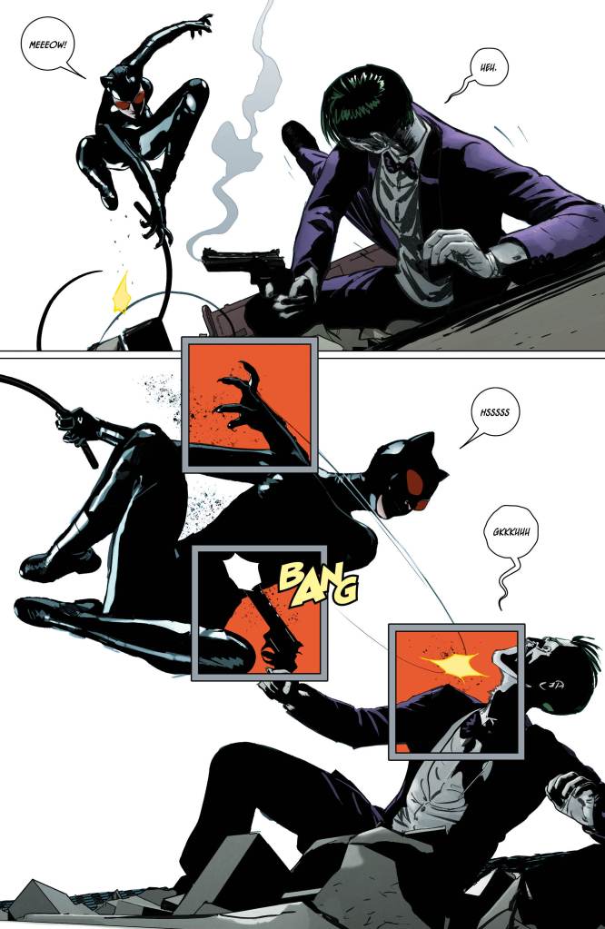 King provides that dynamic in spades this issue, with Batman out cold and both Catwoman and the Joker caught in a stalemate, each trying to reconcile their feelings for the Dark Knight and emphasise who is the most deserving. We’re taken on a real deep dive of both characters’ emotional state and throughout the conflict, that one question we’re all asking is raised – can Batman be Batman if he is happy?
