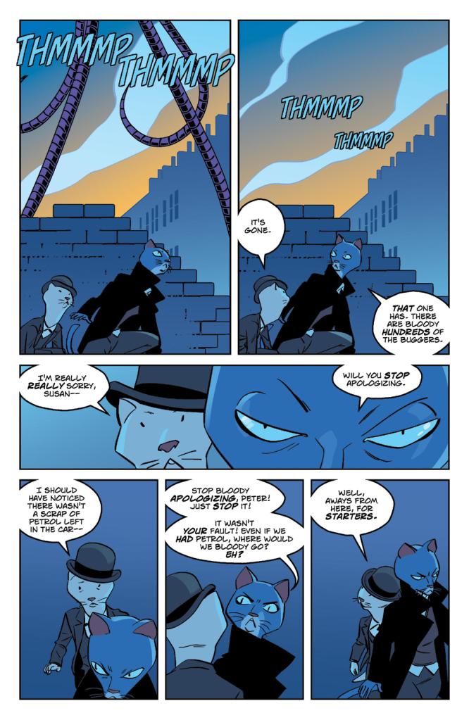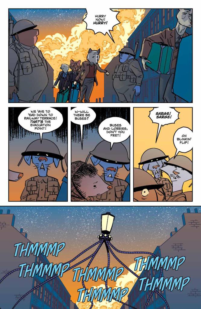 For those of you who aren’t already aware, Wild’s End is a series set in a world full of anthropomorphic animals – a word which finds itself on the brink of destruction at the hands of a brutal alien invasion. Silent, menacing, Victorian lamppost-looking machines patrol the countryside, obliterating anything in their path, and a rag-tag cast of characters see their lives becoming intertwined as they try desperately to survive and, hopefully, find a way to fight back.