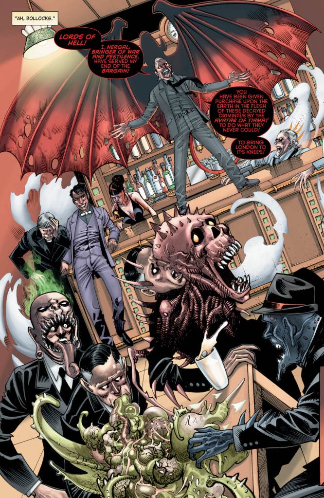 But back to this issue, which picks up where we left off with the return of Nergal to the mortal world along with a heap of beautifully grotesque nightmarish demons (I again say hats off to getting this into a mainstream comic release). The Day Brothers have returned and brought hell itself with them to possess the old-school gangsters of London. And with Nergal at the helm, they mean to take control of London in a way the East End Firms never could, gutting and burning their way through the population of the capital. But don’t worry, John and Huntress are on the case, fighting the hell spawn with the ferocity of a Vatican-sent Bat Family member and the wit and cunning of a scouse mage.